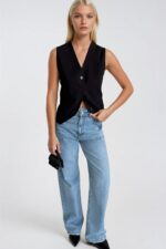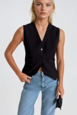 Butona të detajuara, pincë, jelek pa mëngë, pëlhurë me ngjyra të përshtatshme, xhepa të përparmë të rremë, prerje të thellë