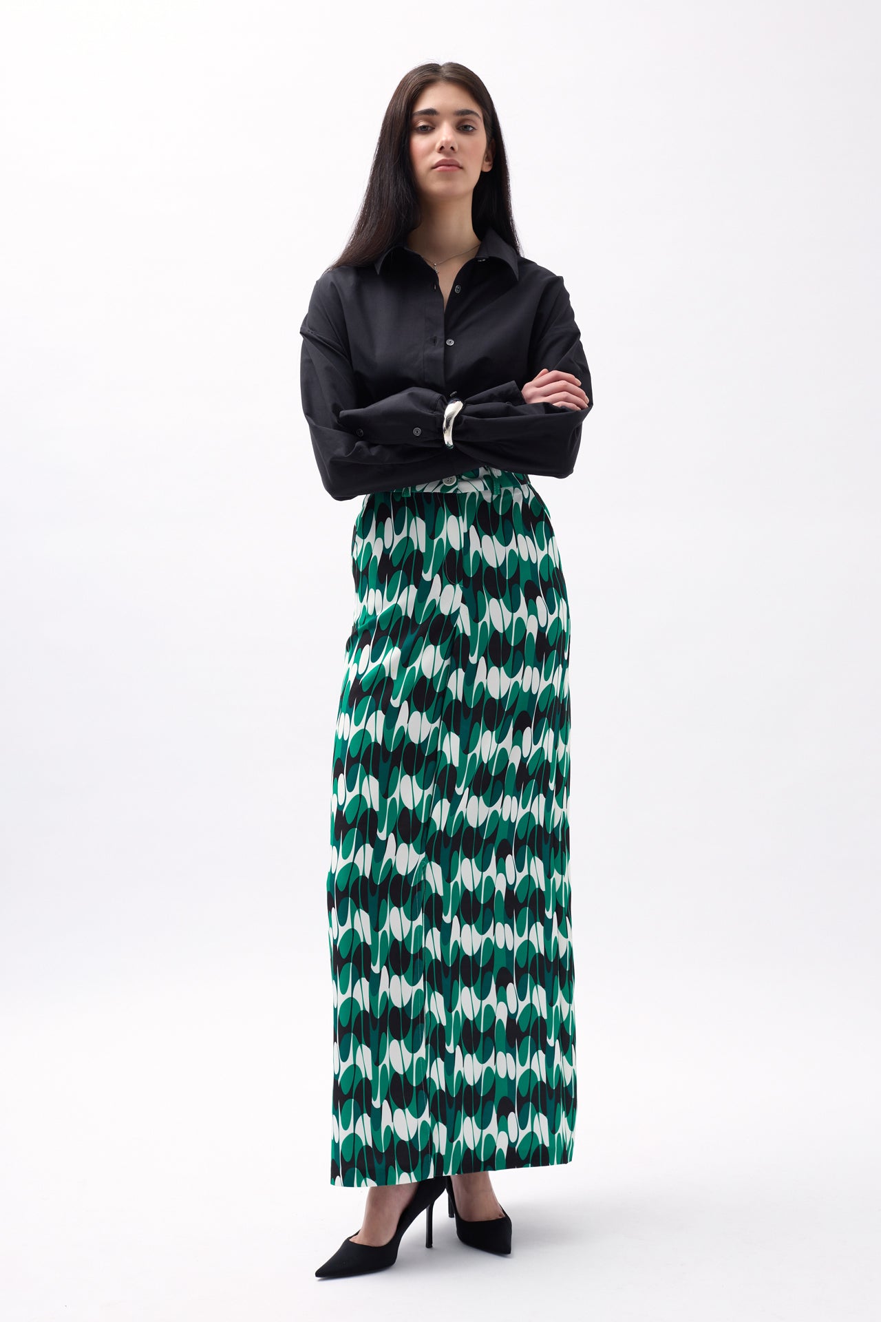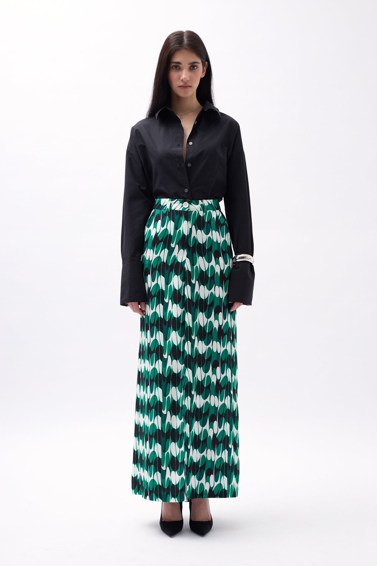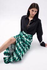 Kopsa e detajuar, e çarë e thellë, pëlhurë likre, bel i ulët, gjatësia midi, pamje asimetrike fundi Modeli i modelit: