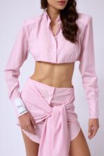 Kravatë e detajuar, pëlhurë pambuku me vija, mbyllje mbështjellëse Mini fund Manekinin Përmasat: Gjoks: 84 cm Beli: 66 cm Ijet: 89 cm Manekini Lartësia: 180 cm Pesha: 55 kg Është madhësia S në manekin. Përmbajtja e produktit: Kodi i produktit: 24S02019