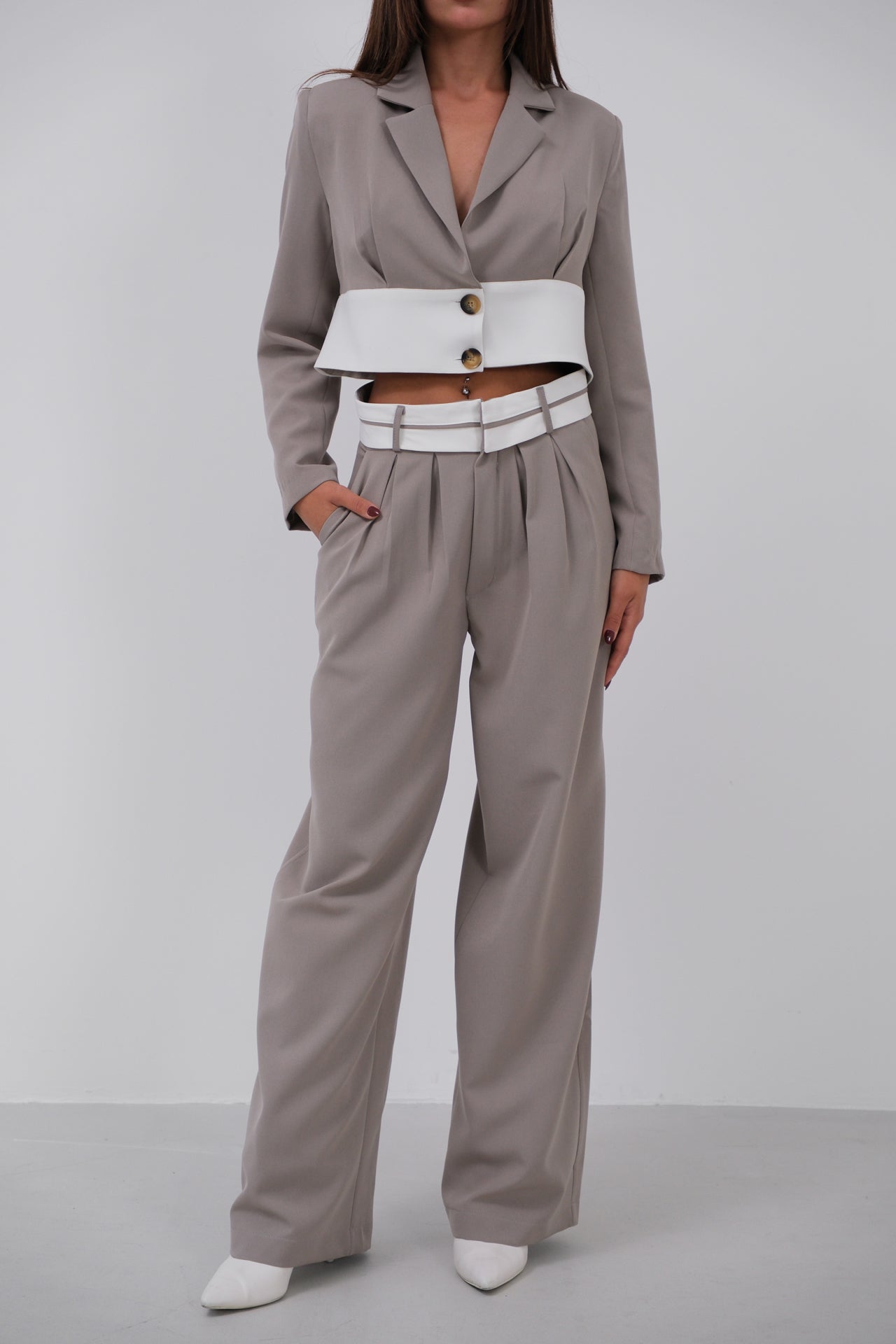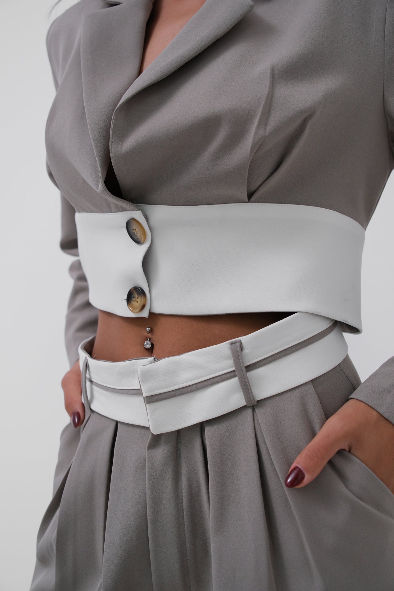 Düğme Detaylı, Garnili, Crop Ceket, Pantolon Takımı Manken Ölçüleri : Göğüs : 85 cm Bel : 58 cm Basen : 90 cm Manken Boy : 174 cm Kilo : 59 kg Manken üzerindeki S bedendir. Ürün İçeriği : 95 Polyester 5 Elestan Ürün Kodu : 24W35001