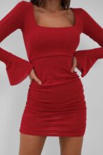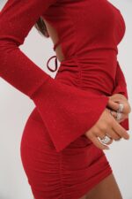 Göğüs Ve Sırt Dekolteli Simli Kırmızı Elbise