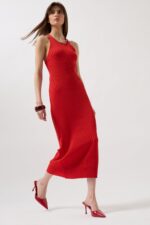 Rrip i dyfishtë me shpatulla të vetme, dekolte barku, pamje asimetrike, thurje trikotazhesh, gjatësi midi, përshtatje e hollë, fustan me