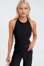 Halter Yaka Kolsuz Bluz Yüksek Bel Dokulu Pantolon İkili Siyah Takım