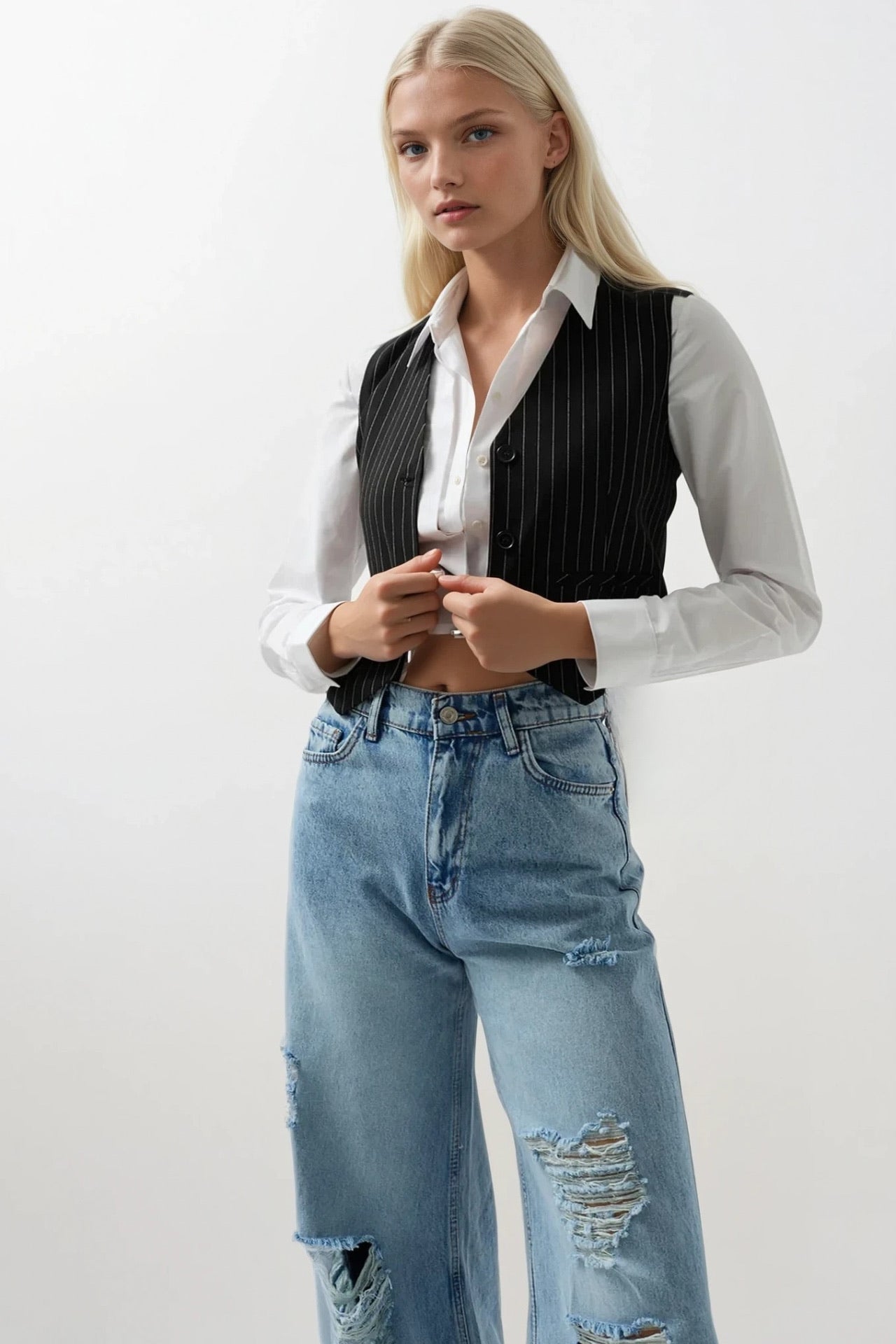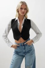 Butona të detajuara, pincë, jelek pa mëngë, pëlhurë me ngjyra të përshtatshme, xhepa të përparmë të rremë, prerje të thellë