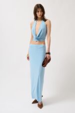 Rrip i dyfishtë me shpatulla të vetme, dekolte barku, pamje asimetrike, thurje trikotazhesh, gjatësi midi, përshtatje e hollë, fustan me