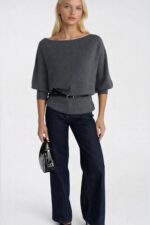 Kemer Detay Kısa Kol Kayık Yaka Antrasit Triko Bluz