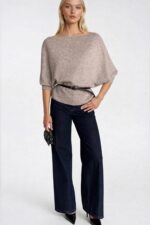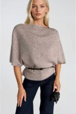 Kemer Detay Kısa Kol Kayık Yaka Bej Triko Bluz