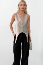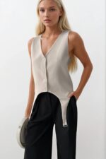 Butona të detajuara, pincë, jelek pa mëngë, pëlhurë me ngjyra të përshtatshme, xhepa të përparmë të rremë, prerje të thellë