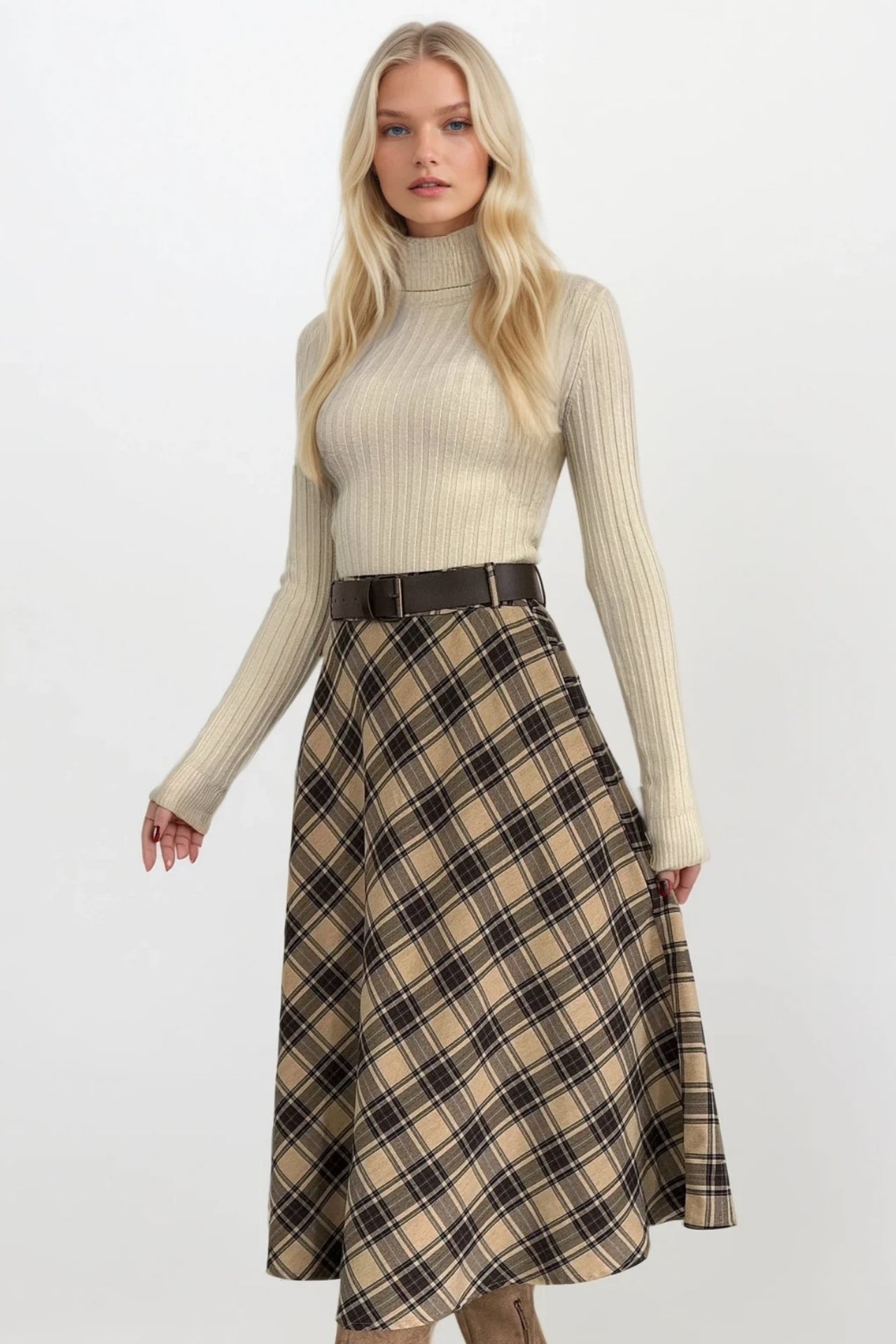 Kemerli Maxi Boy Bej Ekose Etek