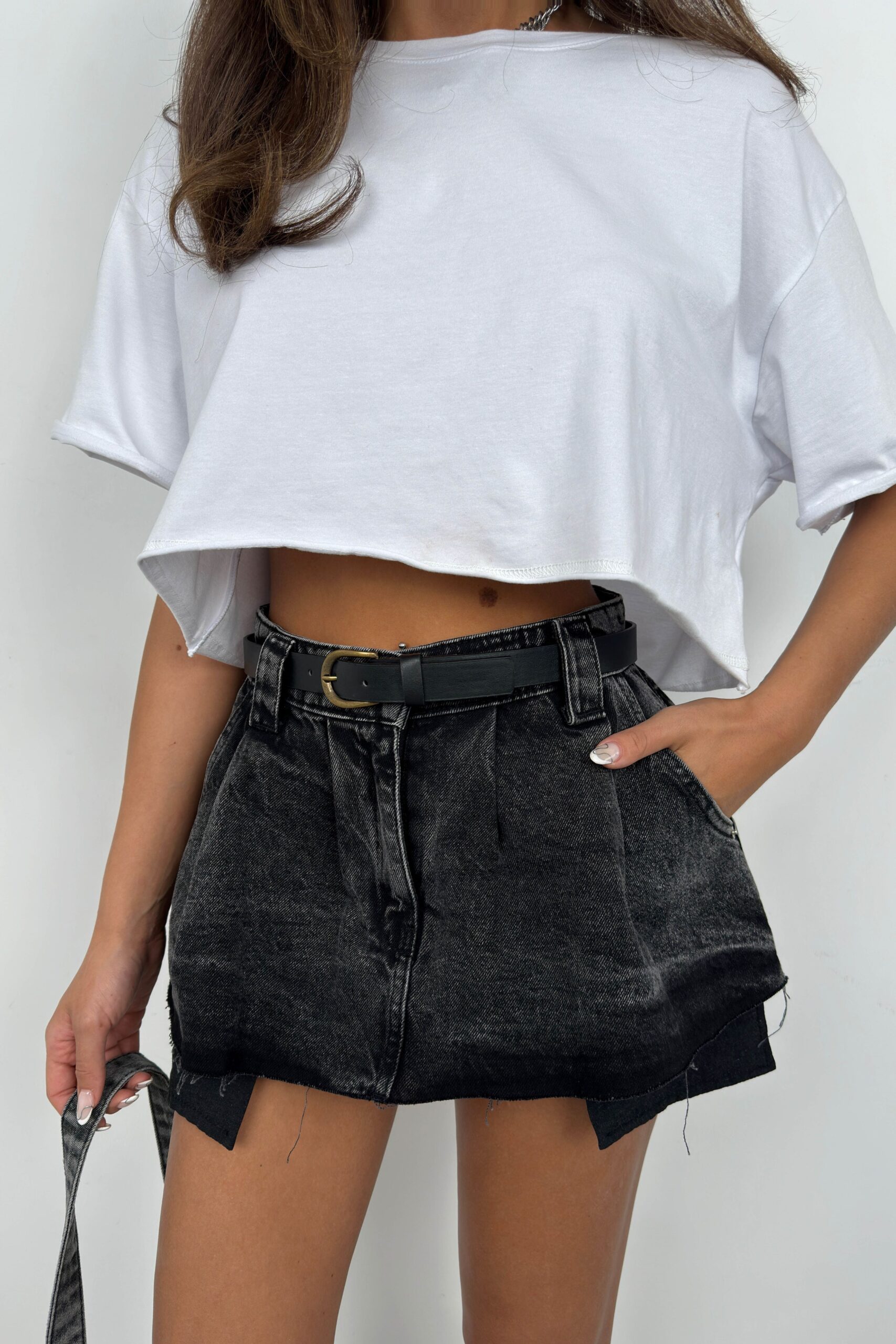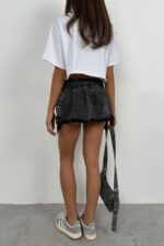 Kemerli Pileli Gri Mini Kot Etek