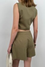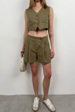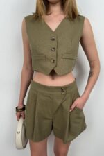 Keten, Crop, Yelek ve Normal Bel Şort Takım Manken Ölçüleri : Göğüs : 85 cm Bel : 62 cm Basen : 91 cm Manken Boy : 173 cm Kilo : 50 kg Manken üzerindeki S bedendir. Ürün İçeriği : 85 Pamuk 15 Keten Ürün Kodu : 23S34008
