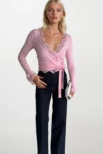 Kruvaze Bağlamalı Dantelli Pembe Bluz