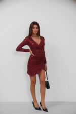 Kruvaze Yaka Pullu Mini Bordo Elbise