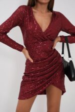 Mini Elbise, Yılbaşı Elbisesi, Fashion, Kruvaze, Pullu, Simli, Uzun Kollu Manken Ölçüleri : Göğüs : 85 cm Bel : 58 cm Basen : 90 cm Manken Boy : 174 cm Kilo : 59 kg Manken üzerindeki S bedendir. Ürün İçeriği : 100 Polyester Ürün Kodu : 24W25061
