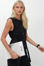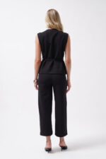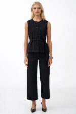 Butona të detajuara, pincë, jelek pa mëngë, pëlhurë me ngjyra të përshtatshme, xhepa të përparmë të rremë, prerje të thellë