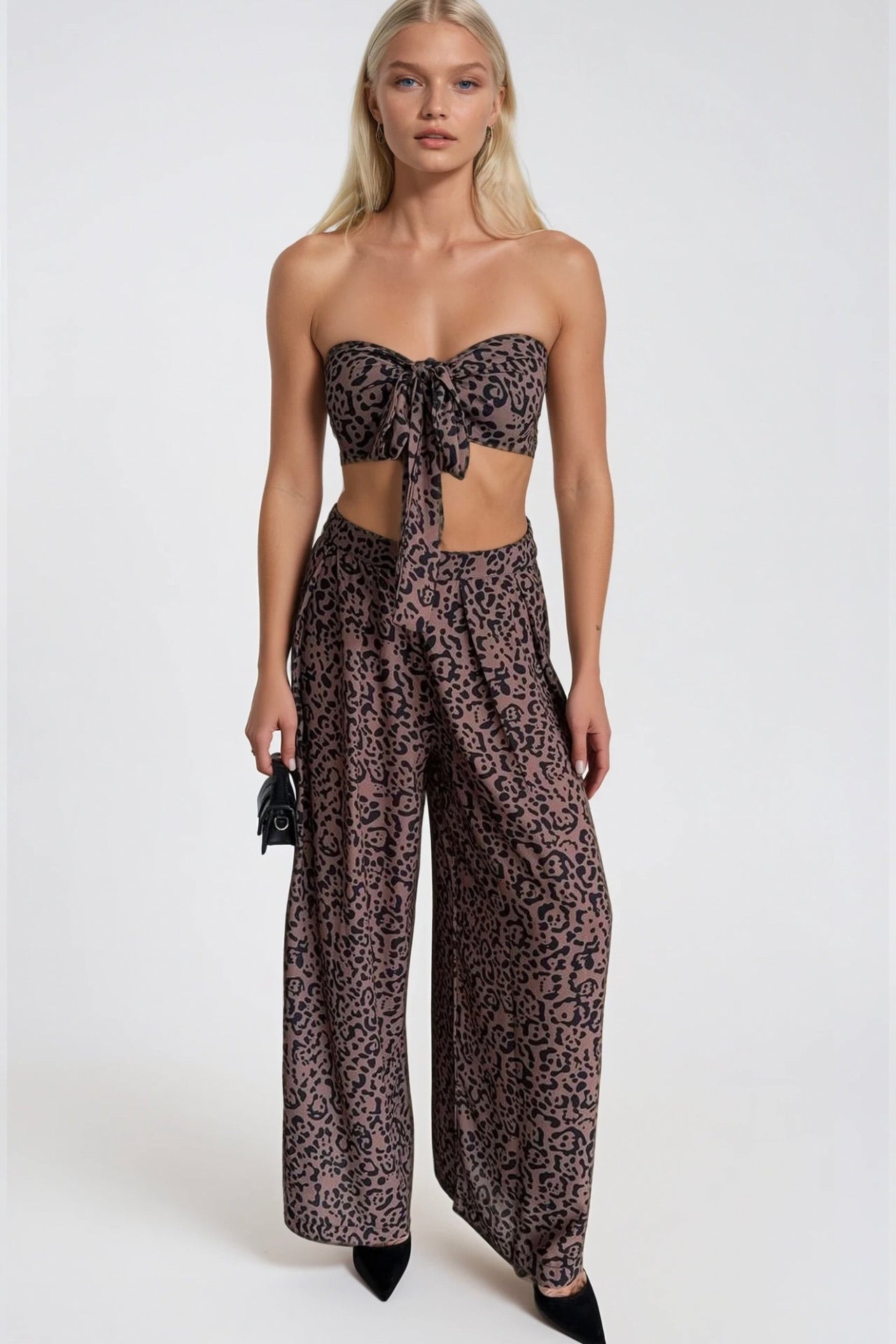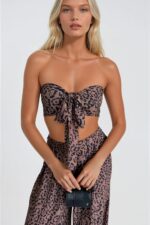 Leopar Desenli Crop Bluz Pantolon İkili Takım