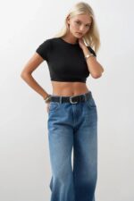 Likralı Basic Crop Siyah T-Shirt