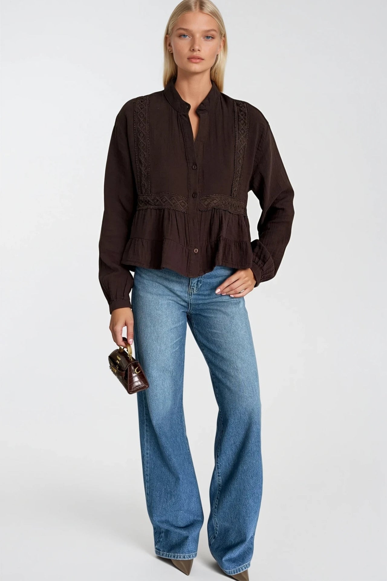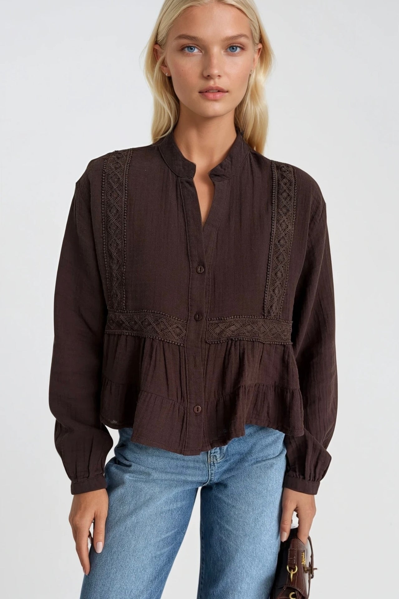 Nakış Detay Eteği Volanlı Kahverengi Bluz