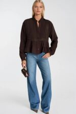 Toprak Tonunun İşlenmiş ZarafetiNakış detayının özgün el işçiliğini eteğin volanlı yapısıyla buluşturan bu kahverengi bluz, toprak tonunun doğal sıcaklığını sofistike bir tasarım diliyle sunuyor. Kahverengi’nin ölçülü derinliği ve nakışın işlenmiş dokusu, bu bluzu gardrobun en rafine toprak tonu parçalarından biri yapıyor.Tasarım Detayları Nakış detayı — özgün el işçiliği ile tasarıma derinlik ve karakter katan premium bir unsur Volanlı etek — feminen, akışkan ve hareketli bir silüet Sıcak kahverengi ton — doğal, sofistike ve toprak paleti ile mükemmel uyum S, M ve L beden seçeneği Nasıl Kombinlenir?Krem ya da bej tonlu yüksek belli bir pantolon ile toprak paleti üzerinden bütünlüklü bir görünüm elde edin; ya da siyah dar paça ile kahverengi nakışın ışıltısını öne çıkarın. Volanlı etek detayı sayesinde ekstra aksesuar gerektirmeden tamamlanmış bir görünüm elde ediyorsunuz.Ürün Kodu: 52115106