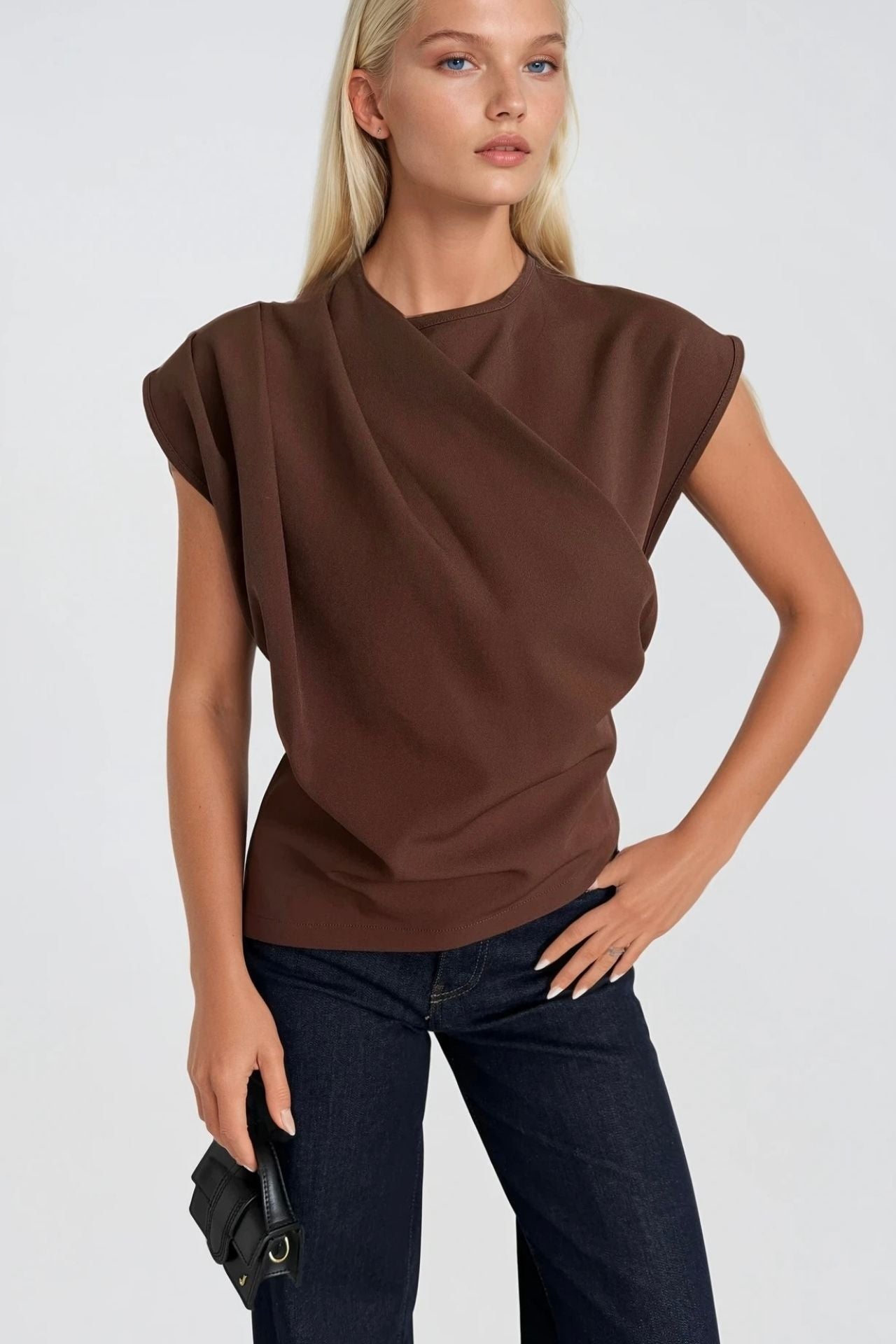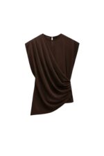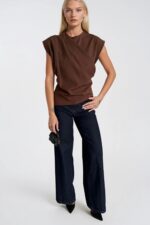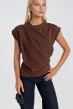 Omuz Büzgülü Sıfır Kol Kahverengi Bluz