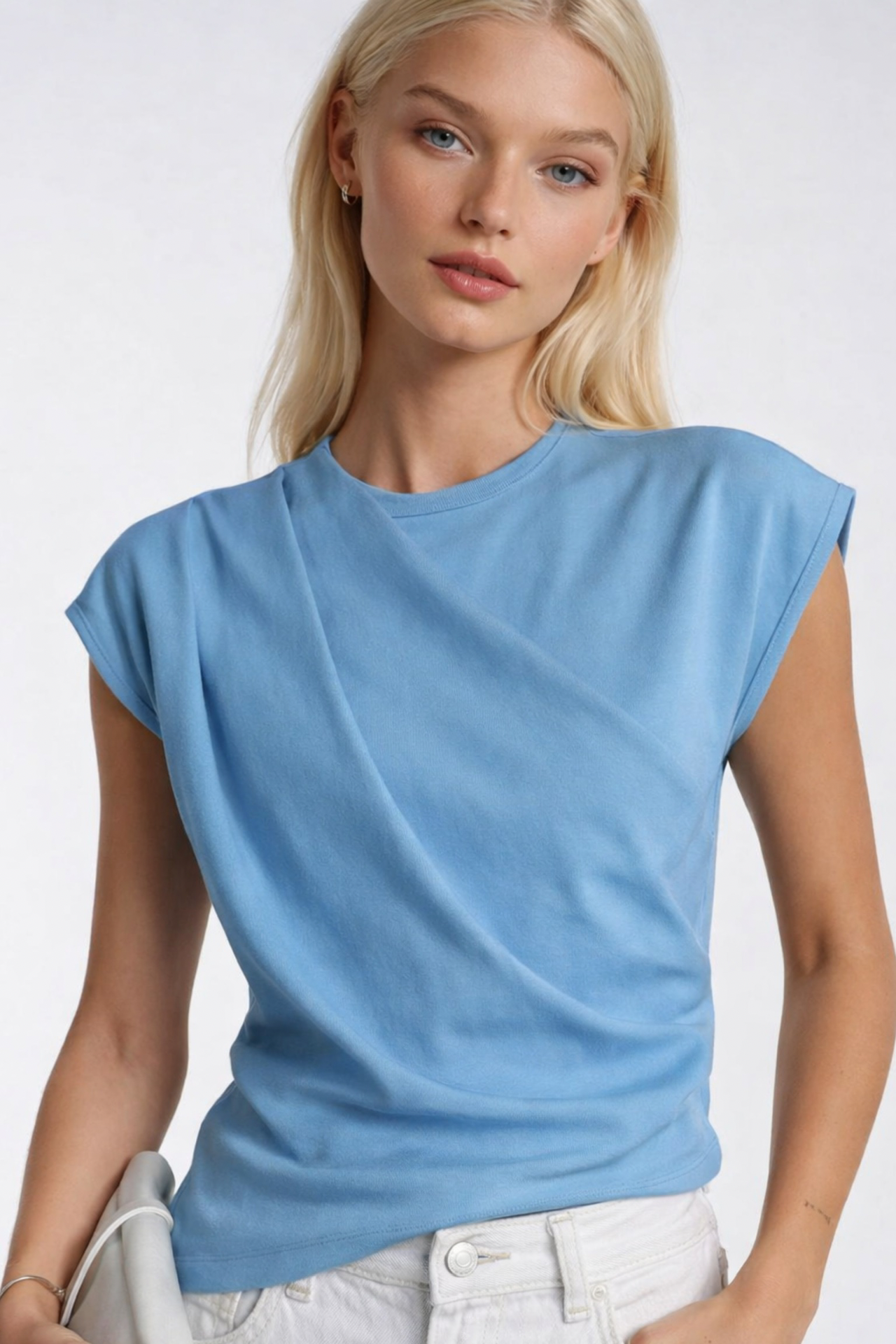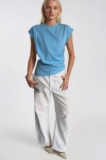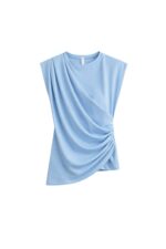Omuz Büzgülü Sıfır Kol Mavi Bluz