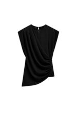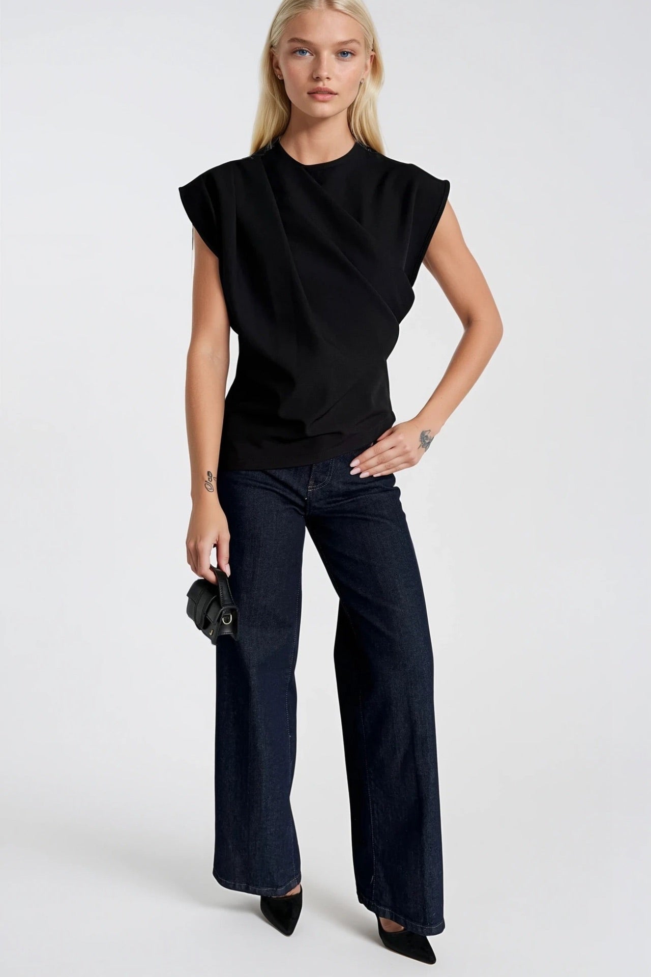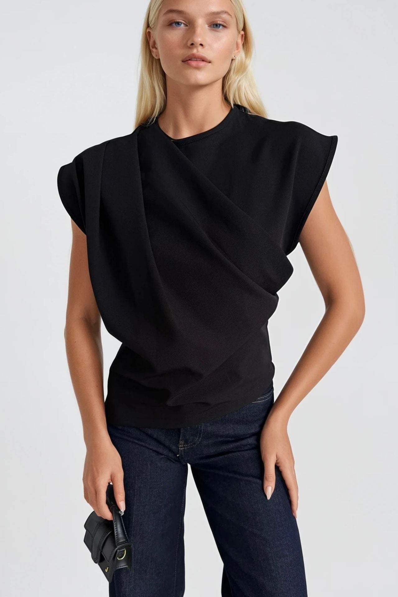 Omuz Büzgülü Sıfır Kol Siyah Bluz