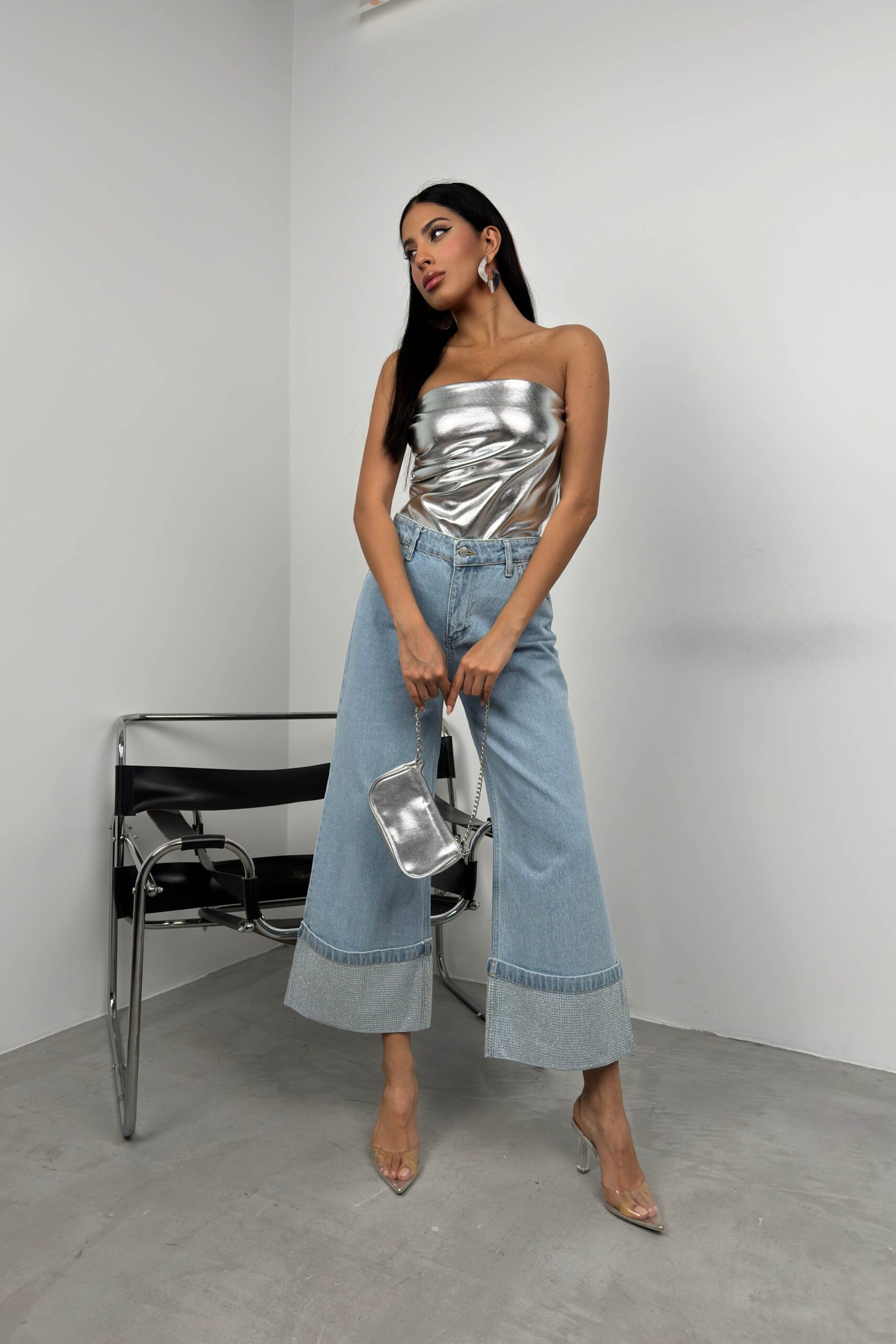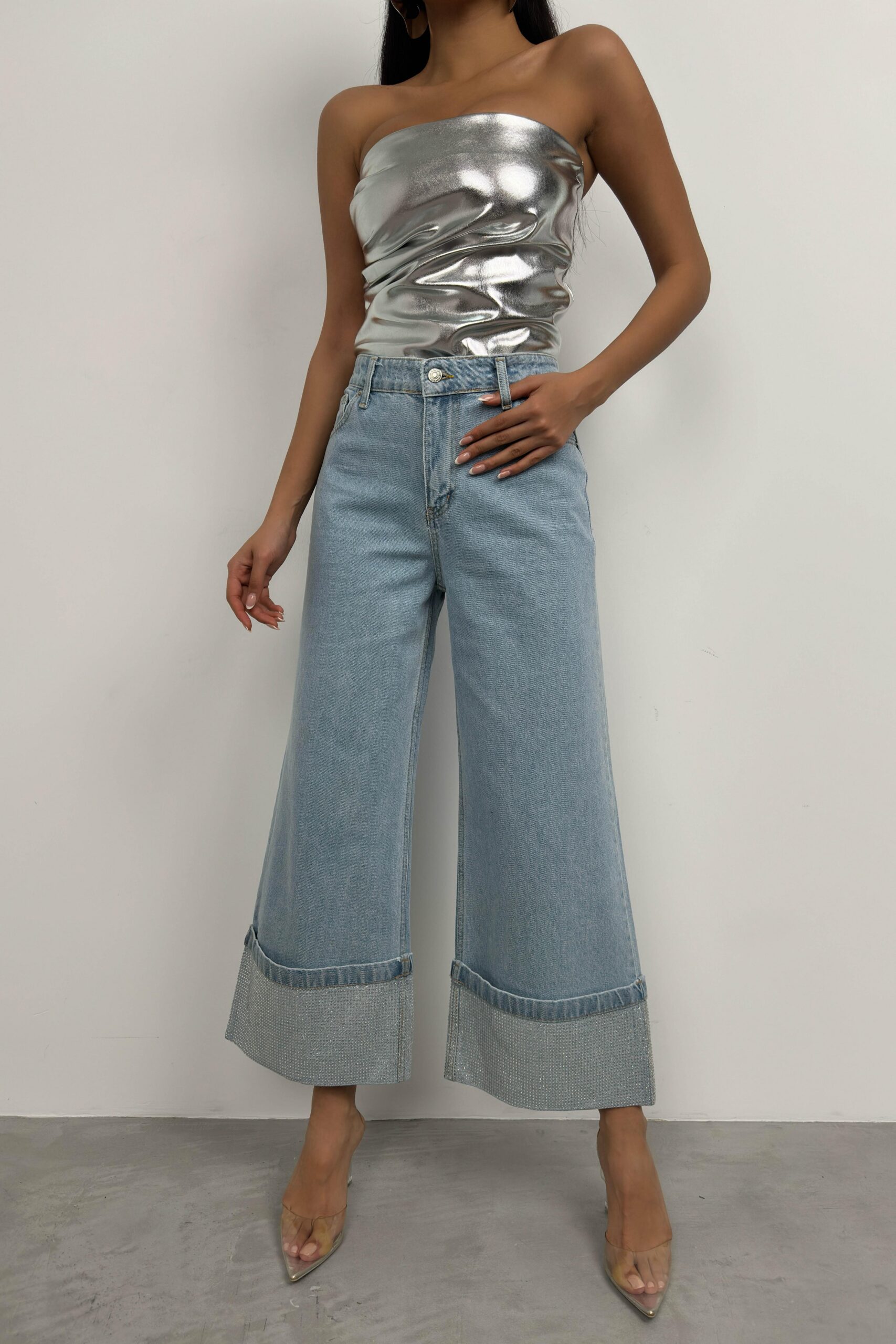 Paçası Taş Detaylı, Yüksek Bel, Bol Paça, Katlamalı Görünümlü Paça Jean Manken Ölçüleri : Göğüs : 89 cm Bel : 68 cm Basen : 95 cm Manken Boy : 177 cm Kilo : 57 kg Manken üzerindeki M bedendir. Ürün İçeriği : 100 Pamuk Ürün Kodu : 23W05026