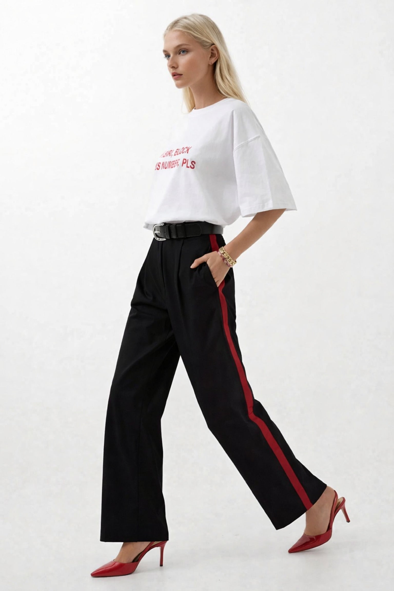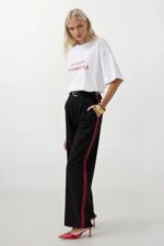Xhepa të dyfishtë anash, kapak xhepi i rremë në pjesën e pasme, plisa të dyfishta, me zinxhir dhe buton i vetëm, detaj me vija kontrasti në anët, pantallona me prerje të drejtë Dimensionet e modelit: Gjoks: 79 cm Beli: 61 cm Ijet: 88 cm Lartësia e modelit: 172 cm Pesha: 54 kg Është madhësia S në manekin. Përmbajtja e produktit: 97 Polyester 3 Elastan Kodi i produktit: 52201030