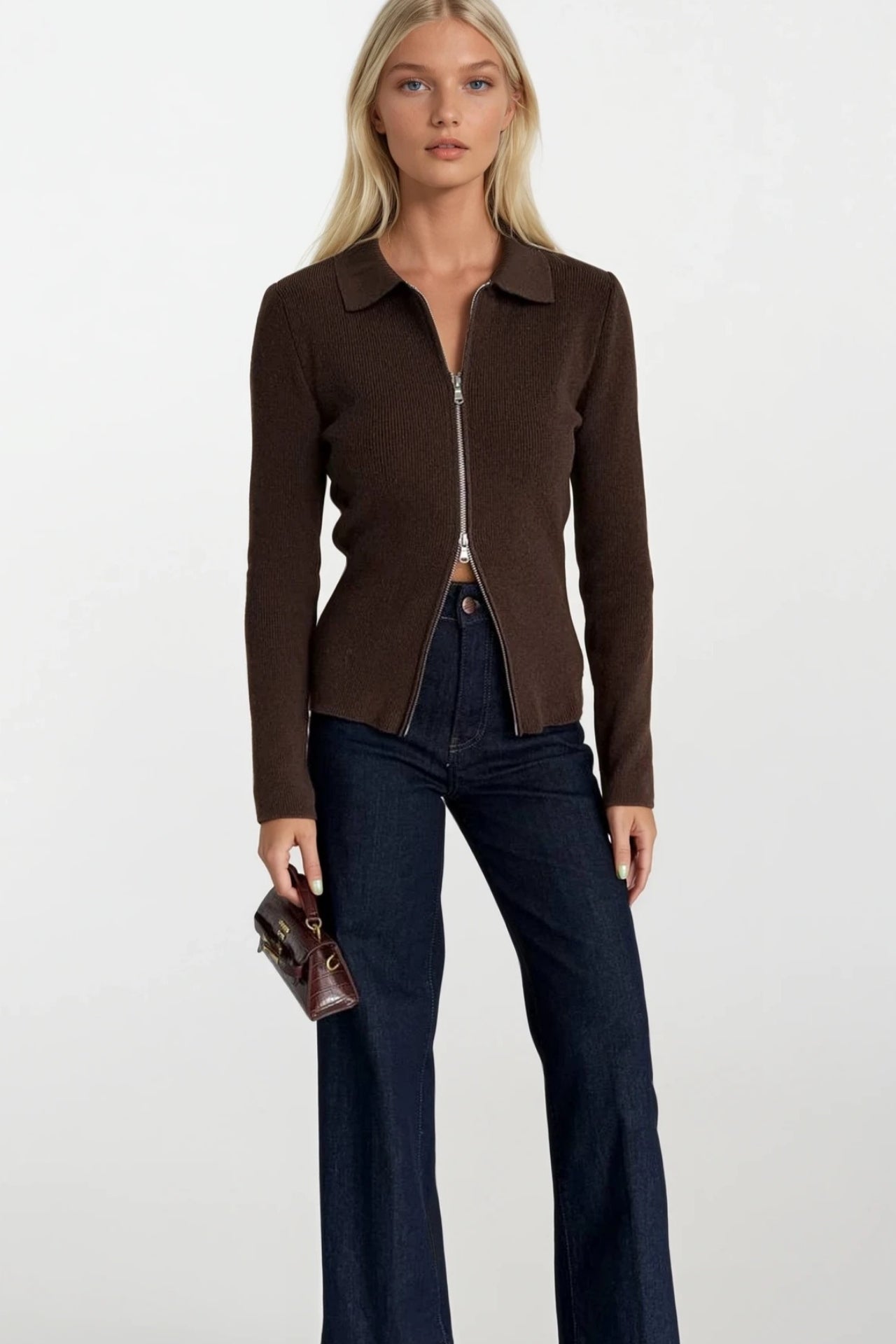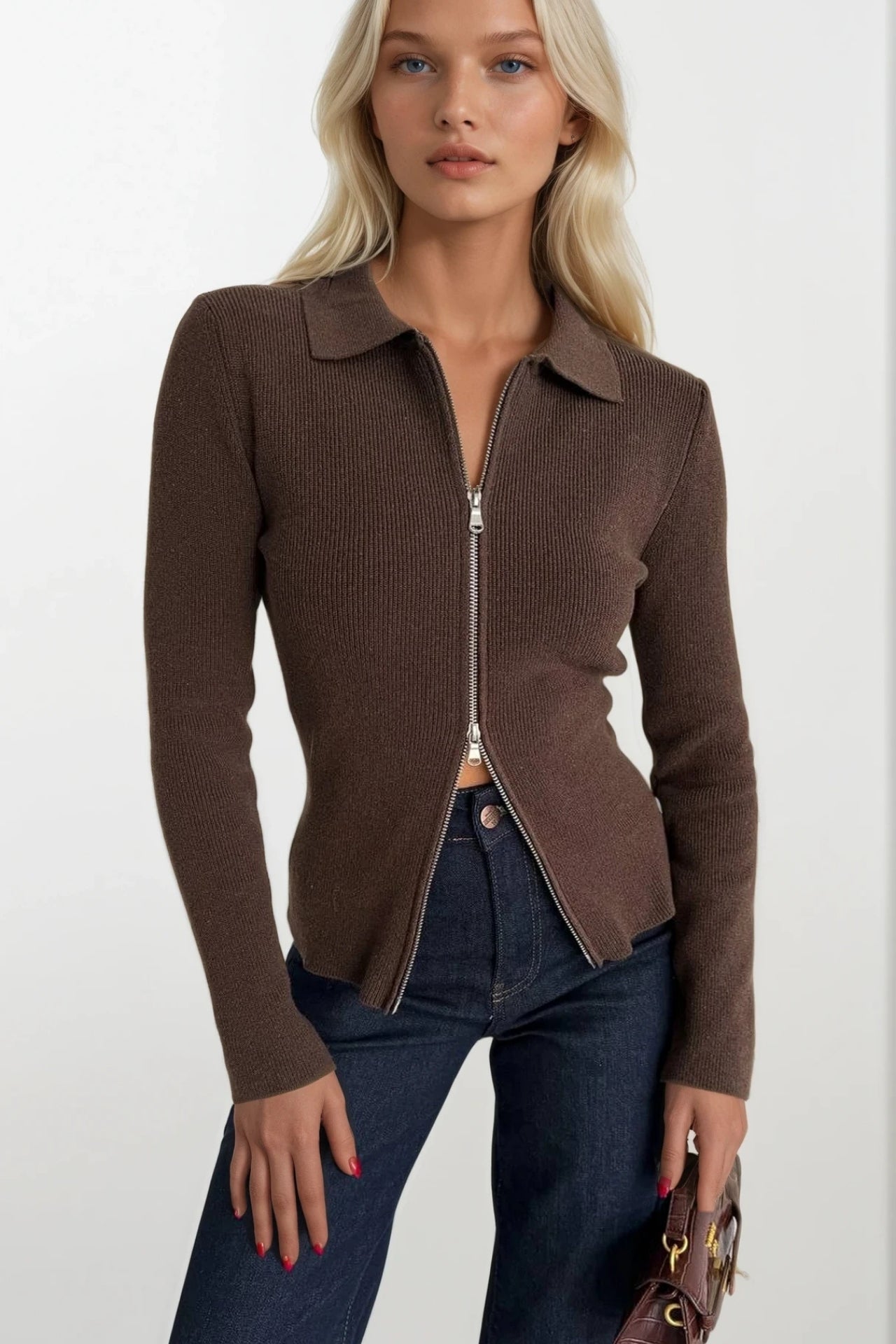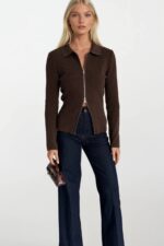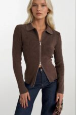 Polo Yaka Çift Fermuarlı Kahverengi Triko Bluz