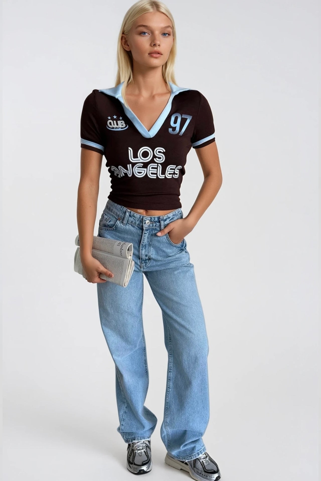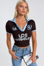 Polo Yaka Çift Renk Baskılı Kahverengi Crop T-Shirt
