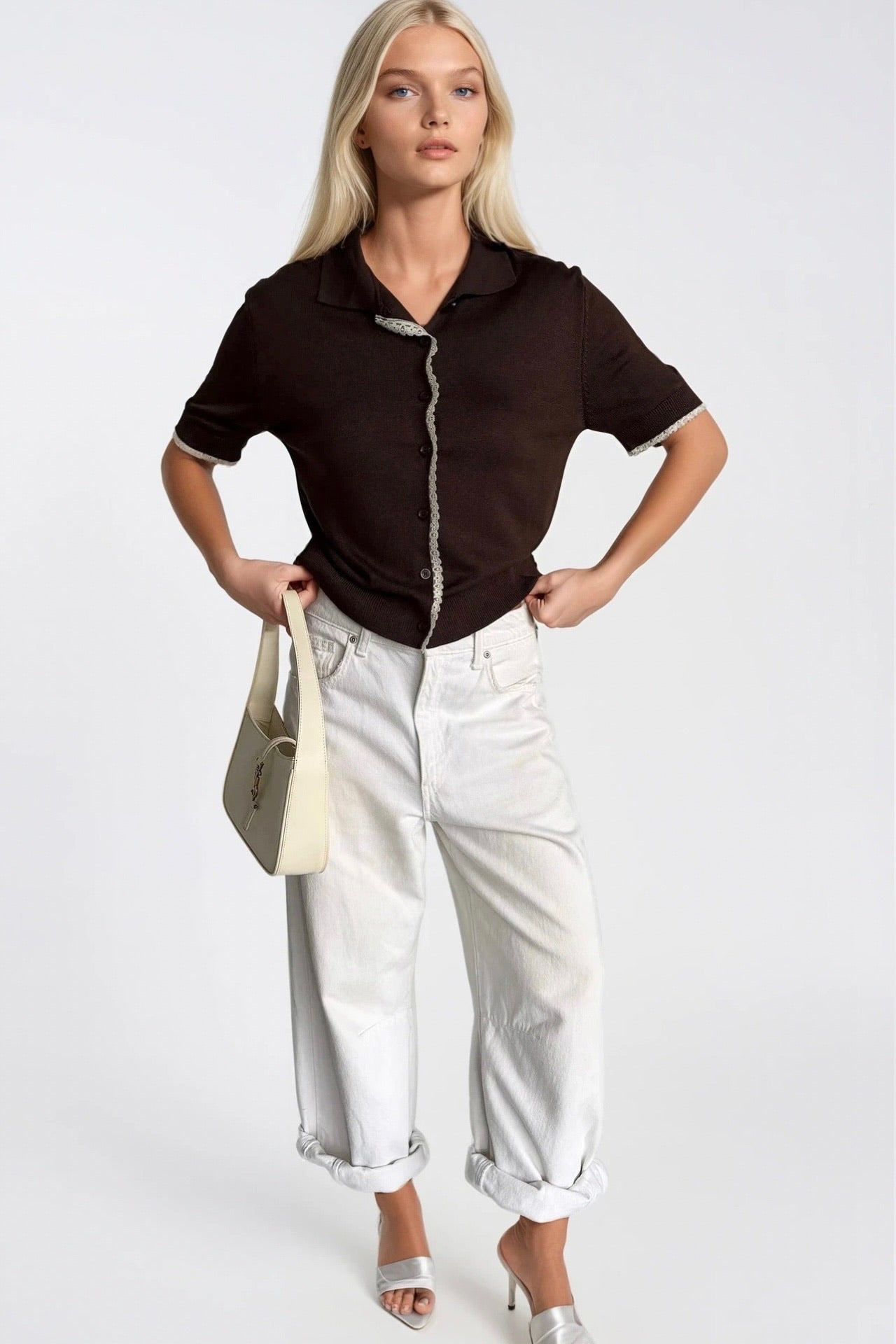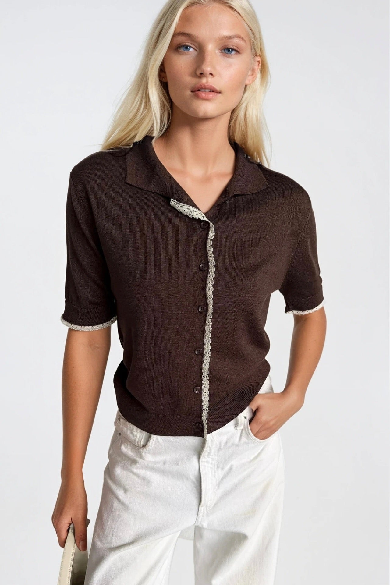 Polo Yaka Dantel Detay Düğmeli Kahverengi Triko Bluz
