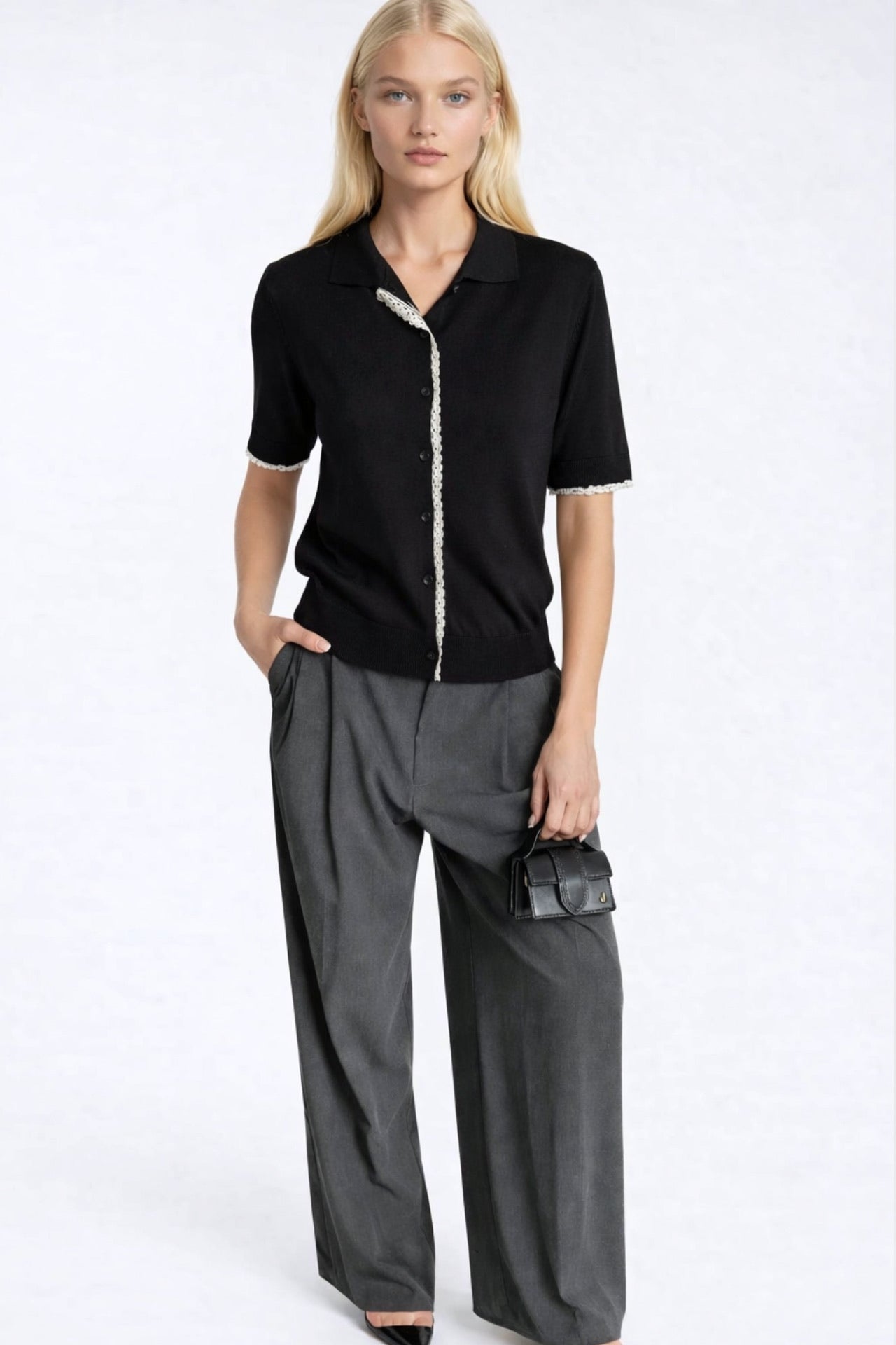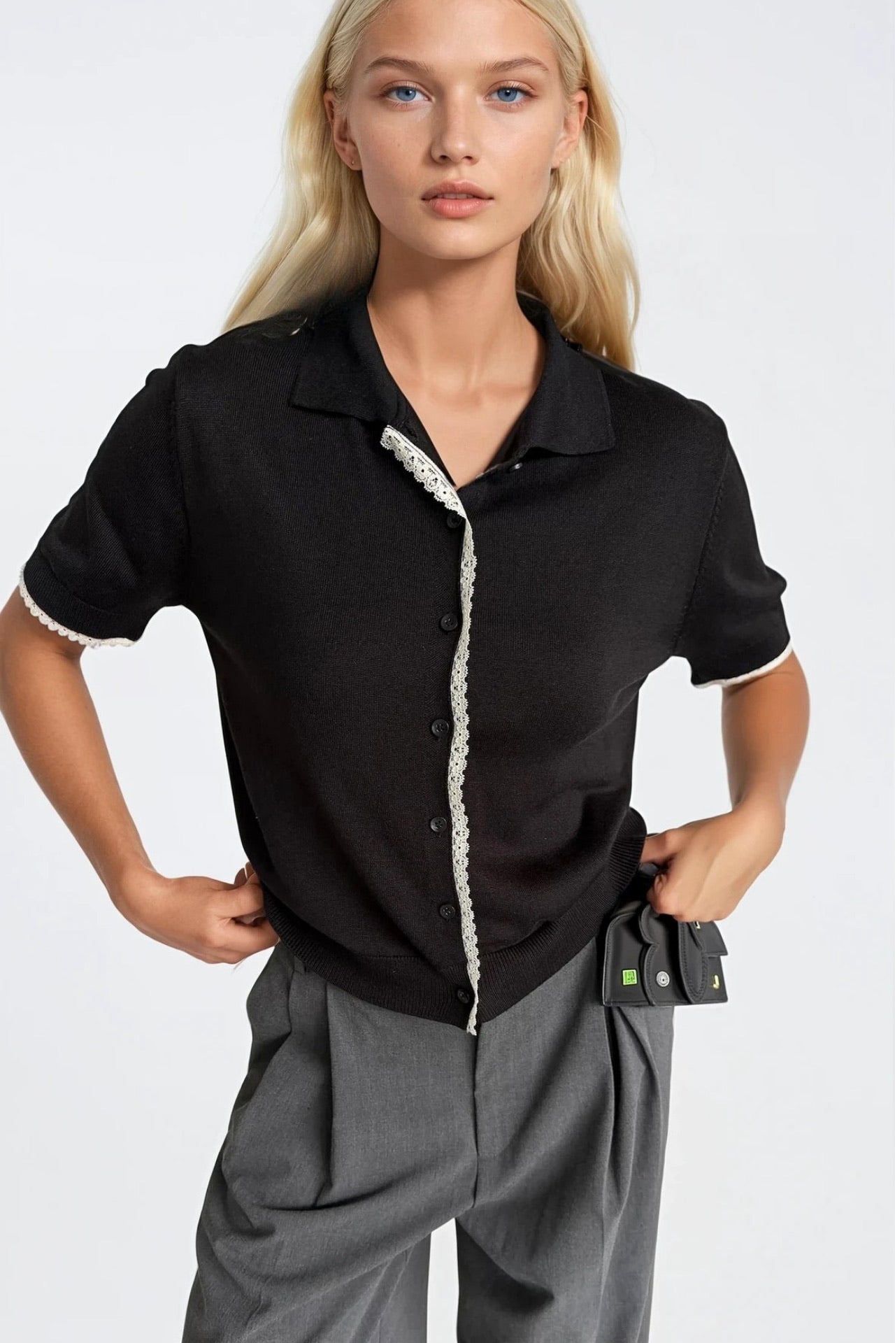 Polo Yaka Dantel Detay Düğmeli Siyah Triko Bluz