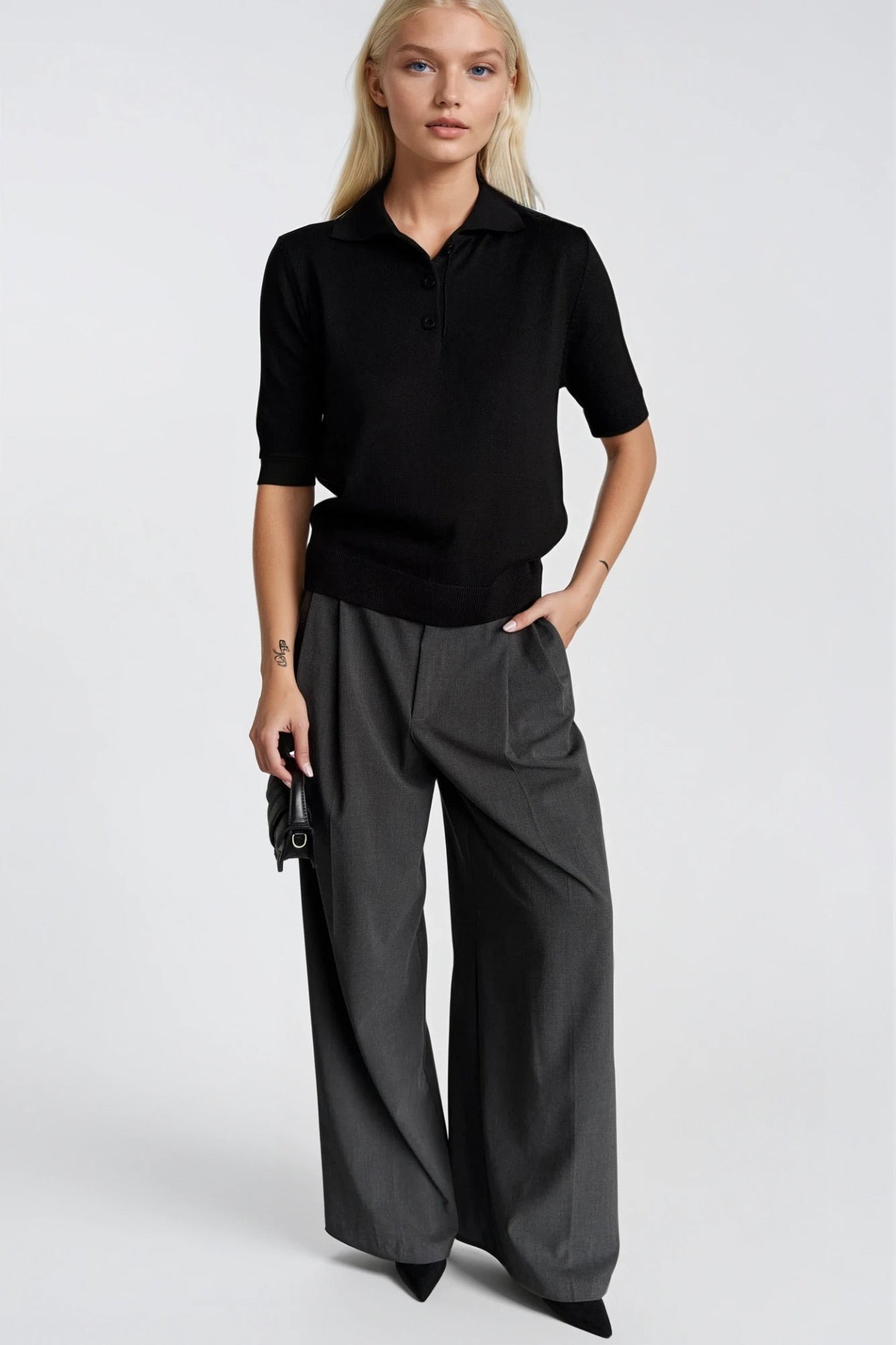 Gündelik Şıklığın Sofistike YorumuPolo yakanın zamansız şıklığını düğmeli detayın özgün karakteriyle buluşturan bu siyah triko bluz, kısa kol kesimiyle hem serin hem de şık bir görünüm sunuyor. Siyahın zamansız otoritesi ve triko kumaşın yumuşak dokusu, bu bluzu gündelik şıklığın en güçlü parçalarından biri yapıyor.Tasarım Detayları Polo yaka — klasik ve sofistike, boynu çerçeveleyen zamansız bir kesim Düğmeli detay — yakalığı açık ya da kapalı kullanma esnekliği sunan özgün bir unsur Kısa kol — serin ve ferah, mevsim geçişlerinde ideal Triko kumaş — yumuşak, hafif ve şekil koruyan yapı Zamansız siyah ton — güçlü, sofistike ve her kombinle uyumlu Standart beden Nasıl Kombinlenir?Beyaz ya da krem tonlu yüksek belli bir pantolon ile şık bir kontrast yakalıyın; ya da siyah üstüne siyah ile güçlü bir monoblock görünüm oluşturun. Polo yaka düğmelerini açık bırakarak daha rahat, kapalı tutarak daha sofistike bir karakter yaratabilirsiniz.Ürün Kodu: 52115112