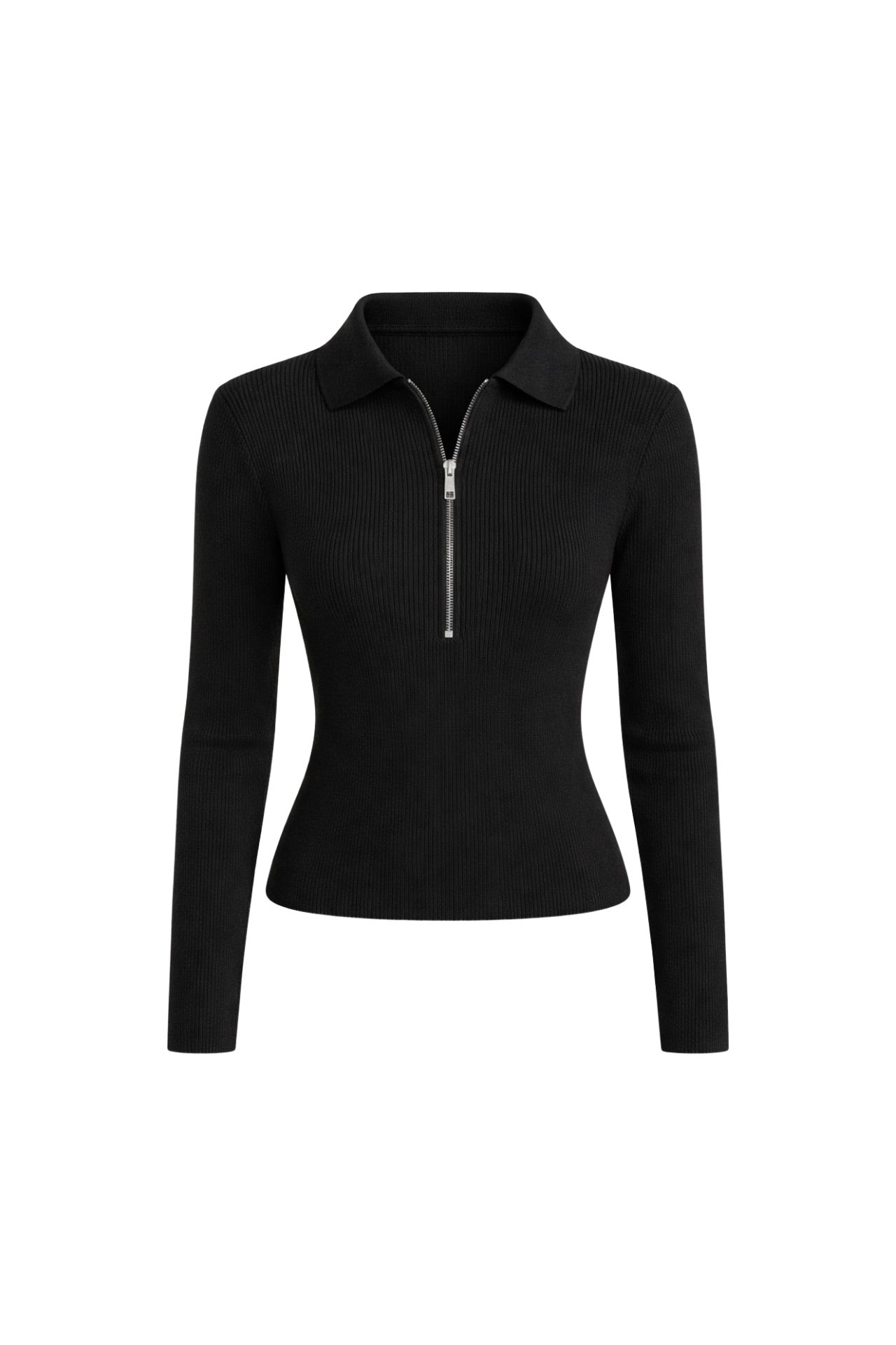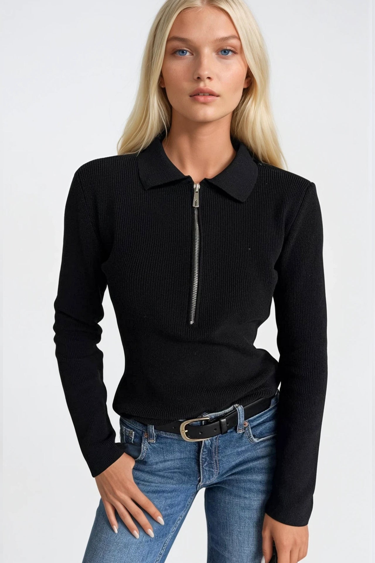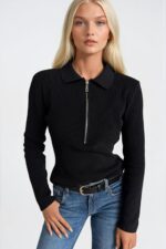 Polo Yaka Fermuar Detay Siyah Triko Bluz
