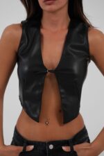 Kalın Askılı, Crop, Aksesuar Detaylı, Deri Yelek Manken Ölçüleri : Göğüs : 85 cm Bel : 58 cm Basen : 90 cm Manken Boy : 174 cm Kilo : 59 kg Manken üzerindeki S bedendir. Ürün İçeriği : 100 Polyester Ürün Kodu : 24W12003