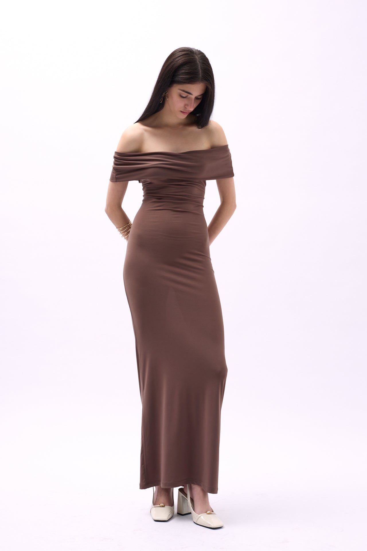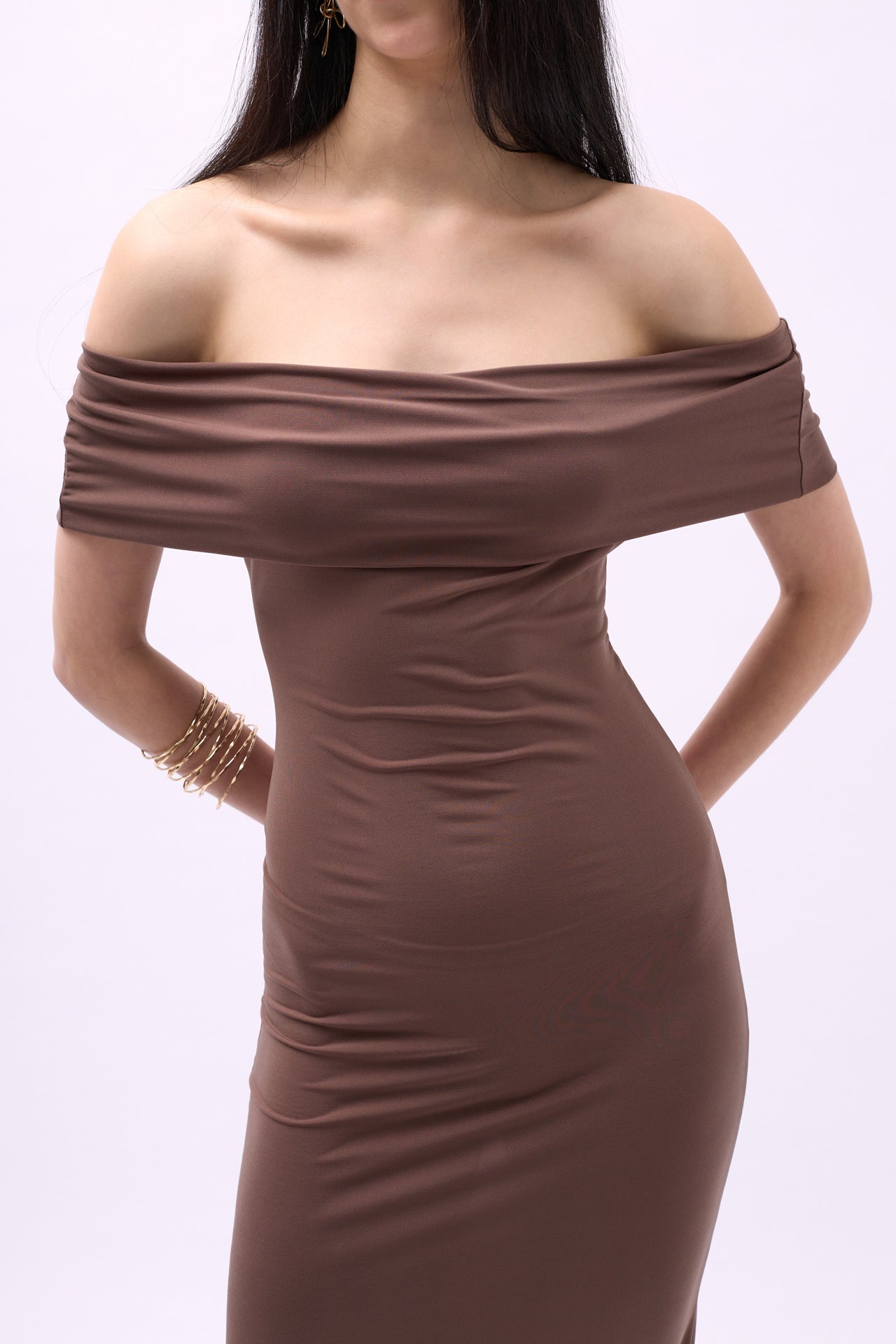 Rrip i dyfishtë me shpatulla të vetme, dekolte barku, pamje asimetrike, thurje trikotazhesh, gjatësi midi, përshtatje e hollë, fustan me