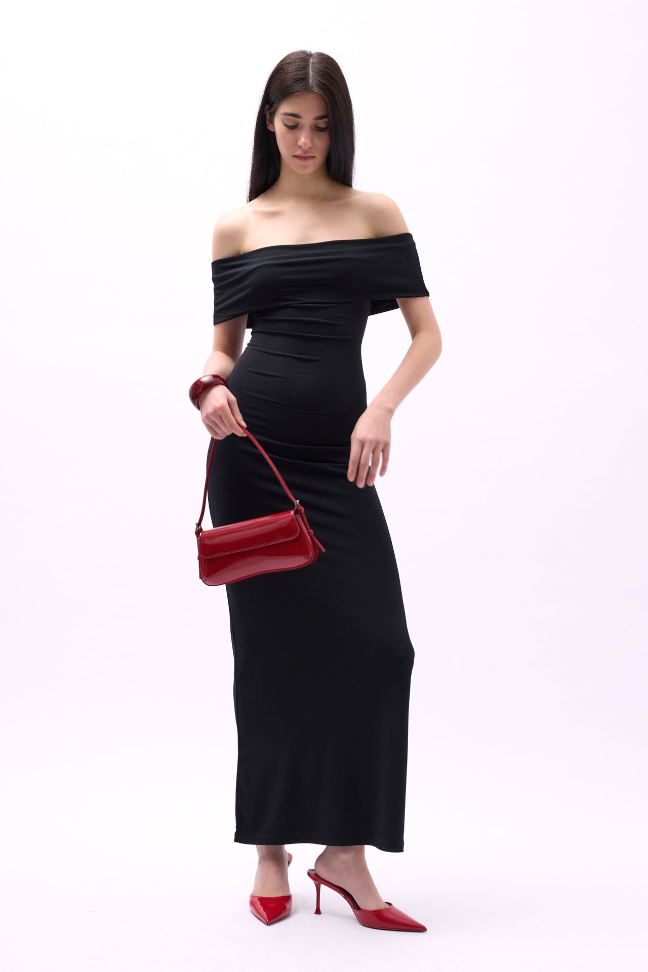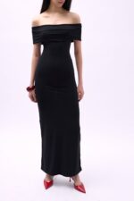 Rrip i dyfishtë me shpatulla të vetme, dekolte barku, pamje asimetrike, thurje trikotazhesh, gjatësi midi, përshtatje e hollë, fustan me