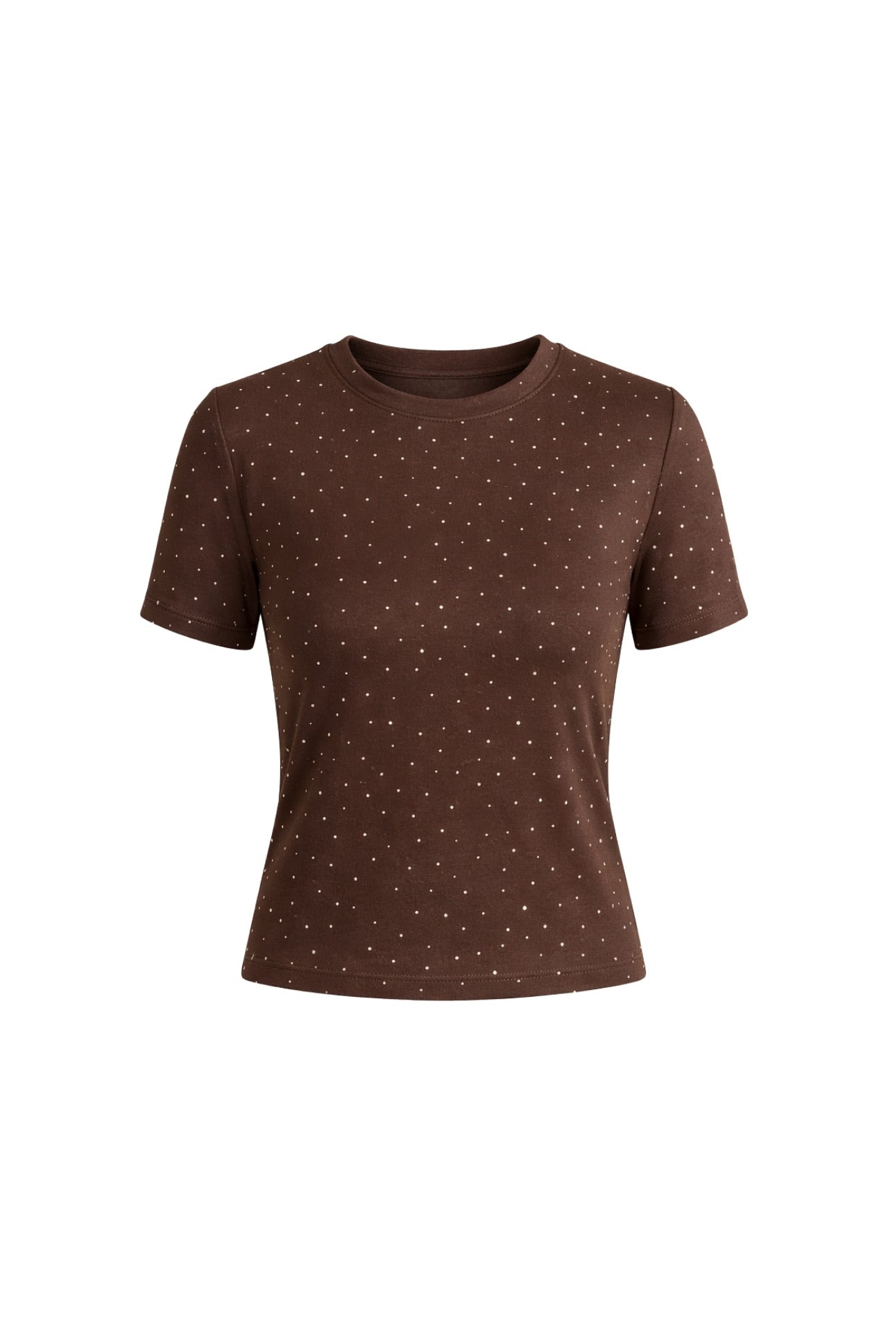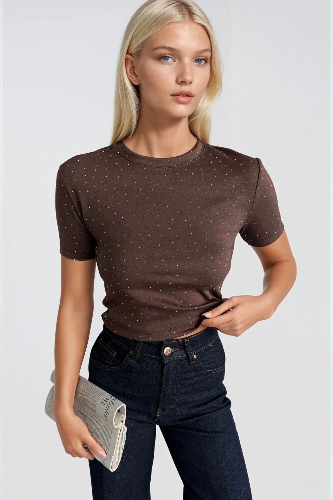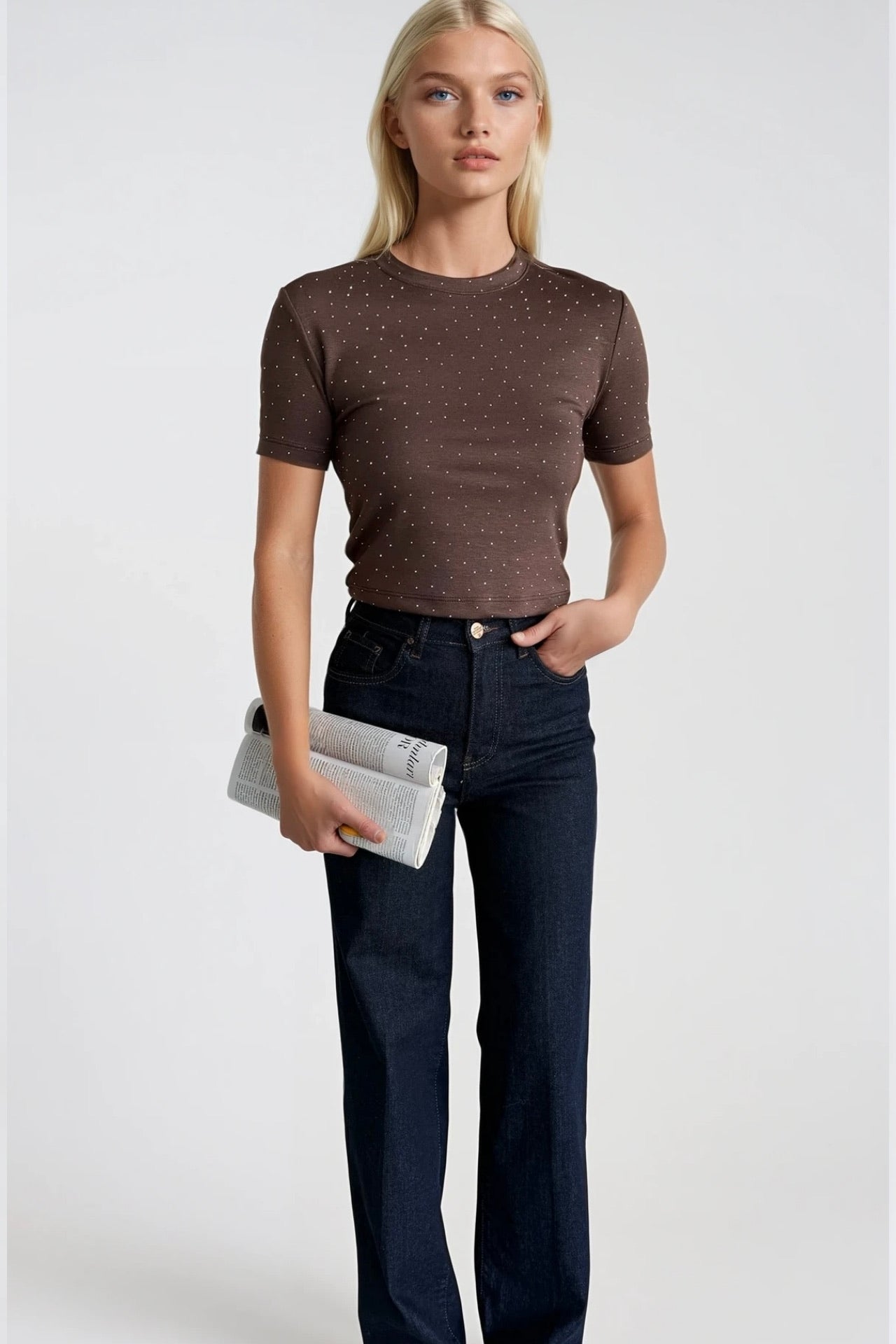 Taş Detay Likralı Kahverengi Crop T-Shirt