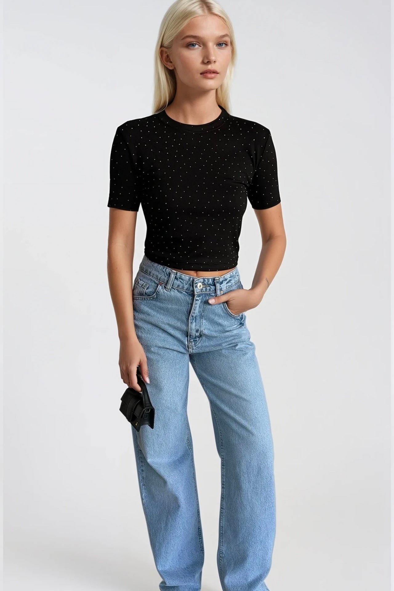 Taş Detay Likralı Siyah Crop T-Shirt