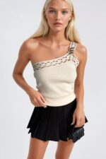 Tek Omuz Aksesuar Detay Ekru Triko Bluz
