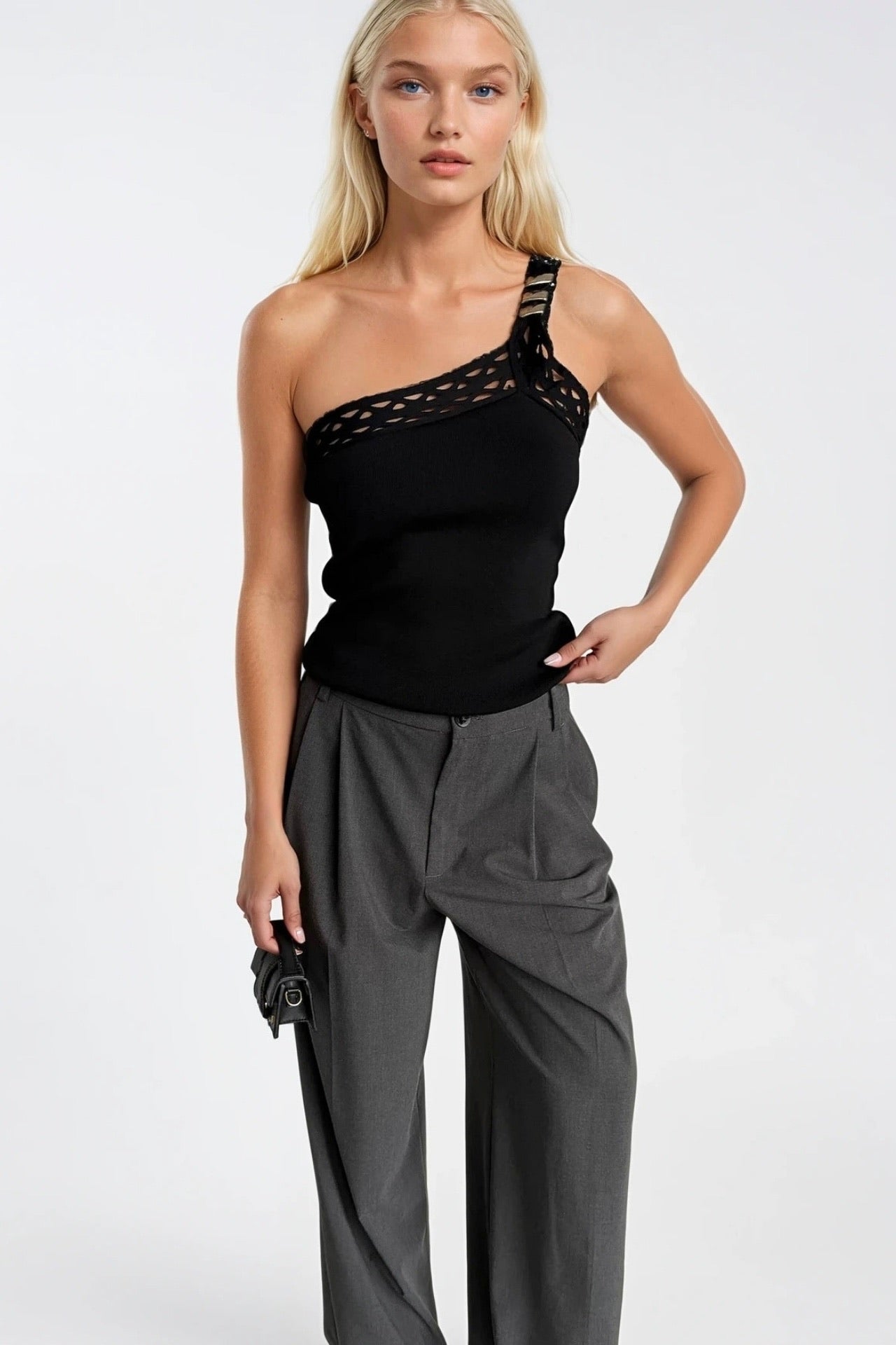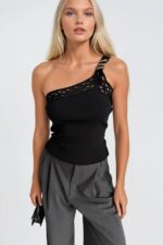 Tek Omuz Aksesuar Detay Siyah Triko Bluz