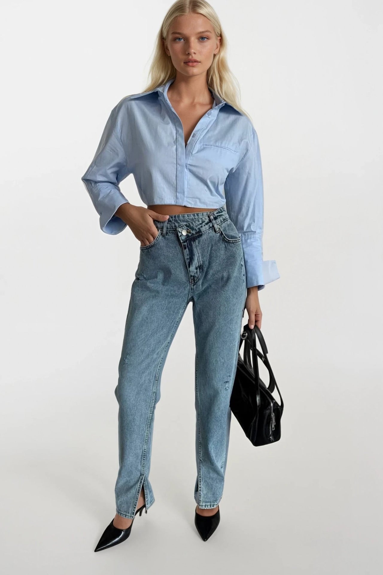 Prerje ovale, jakë këmishë, mëngë të gjata, këmishë Ultra Crop Modeli i modelit: Gjoks: 85 cm Beli: 58 cm Ijet: