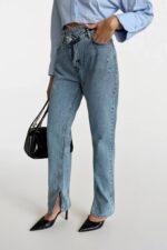 Xhinse asimetrike me lazer blu të hapur me funde të grisura