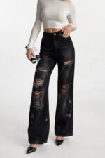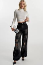 Xhinse të zeza me bel të lartë me këmbë të gjerë të prera me lazer