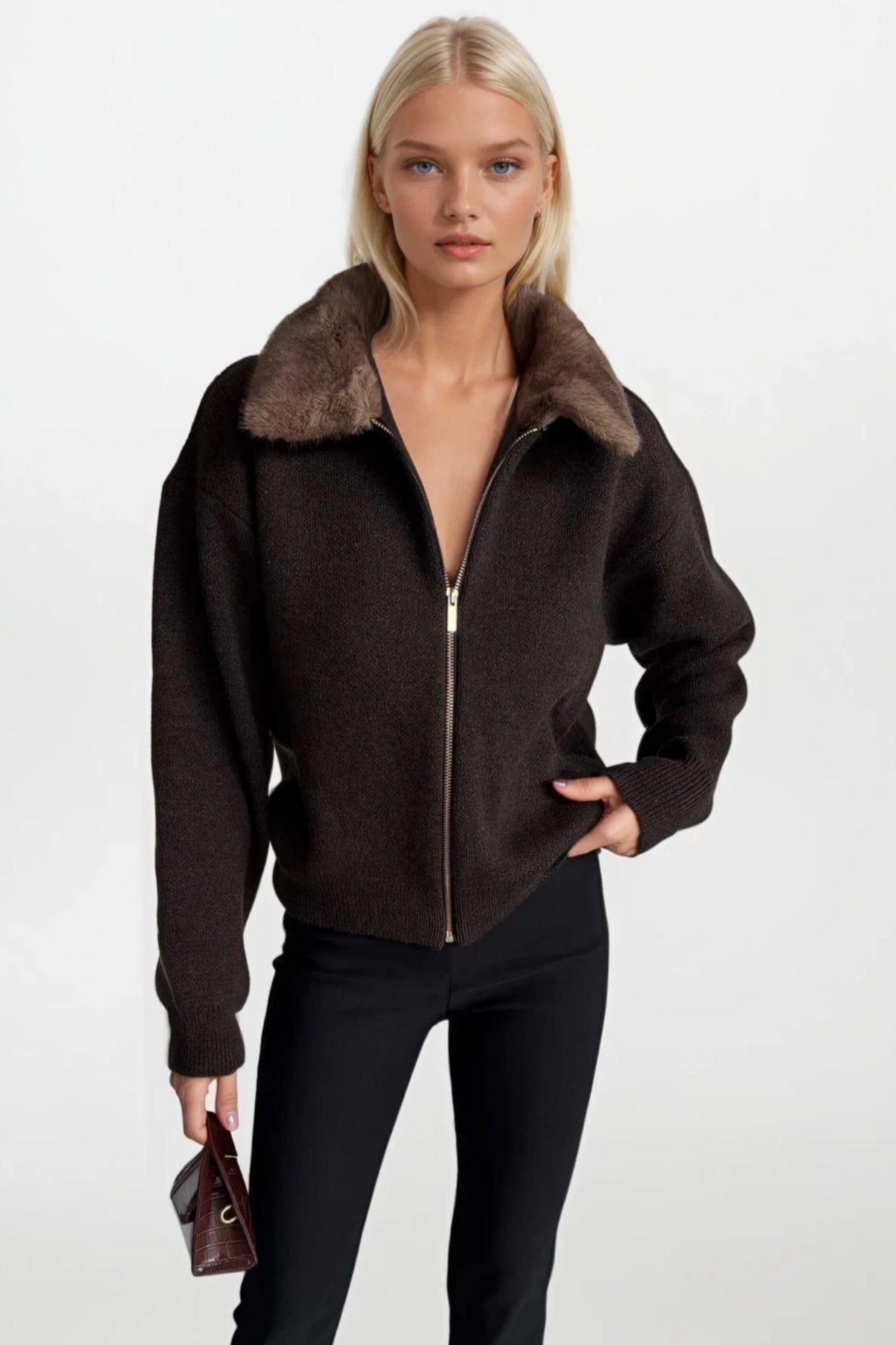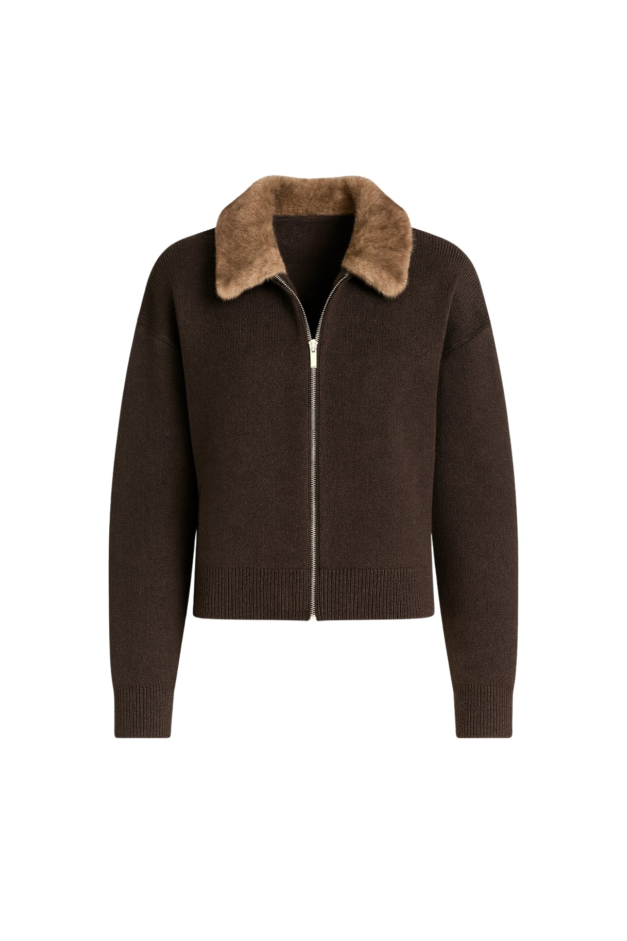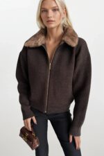 Yaka Kürk Detay Fermuarlı Kahverengi Triko Kazak