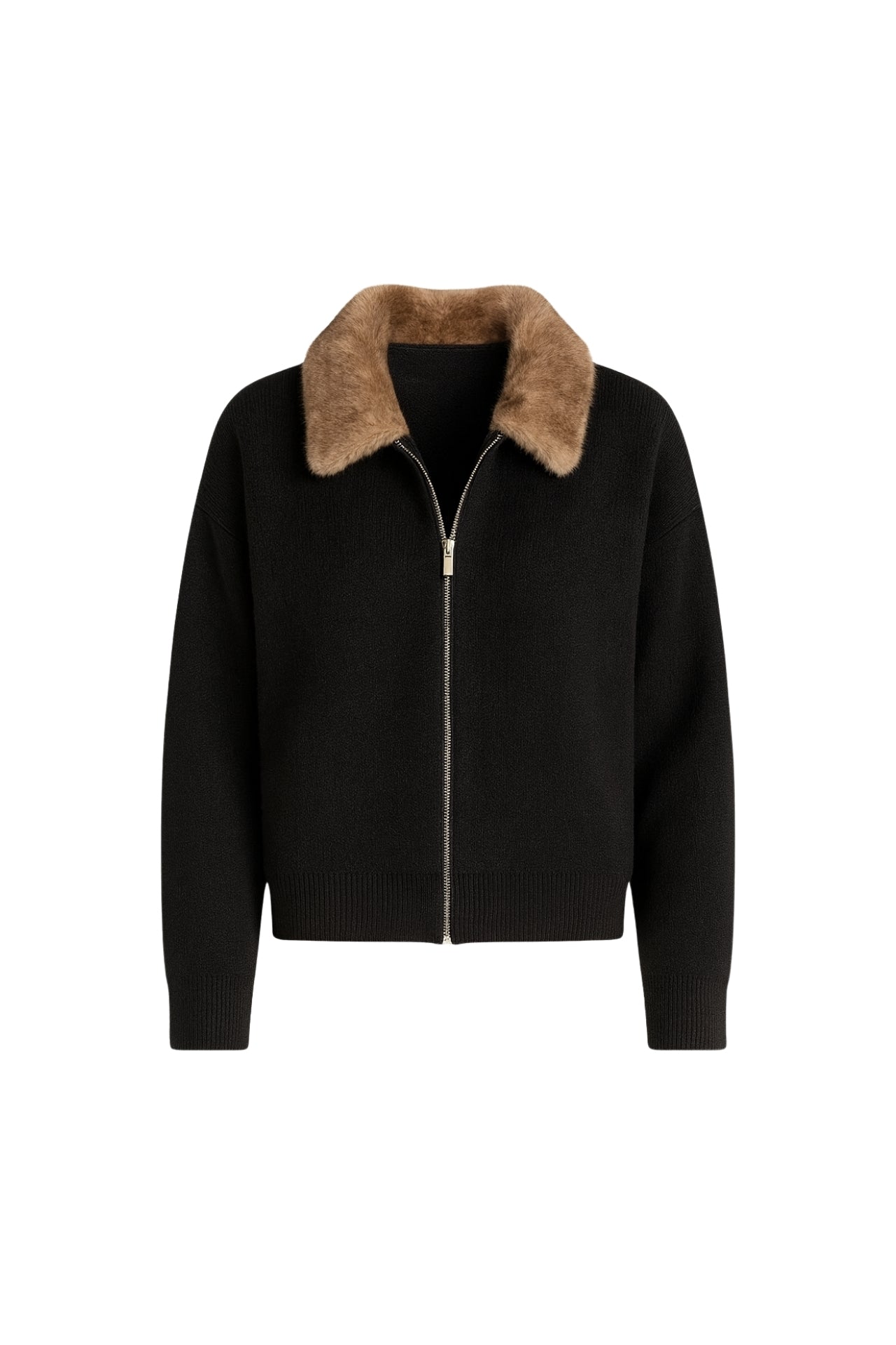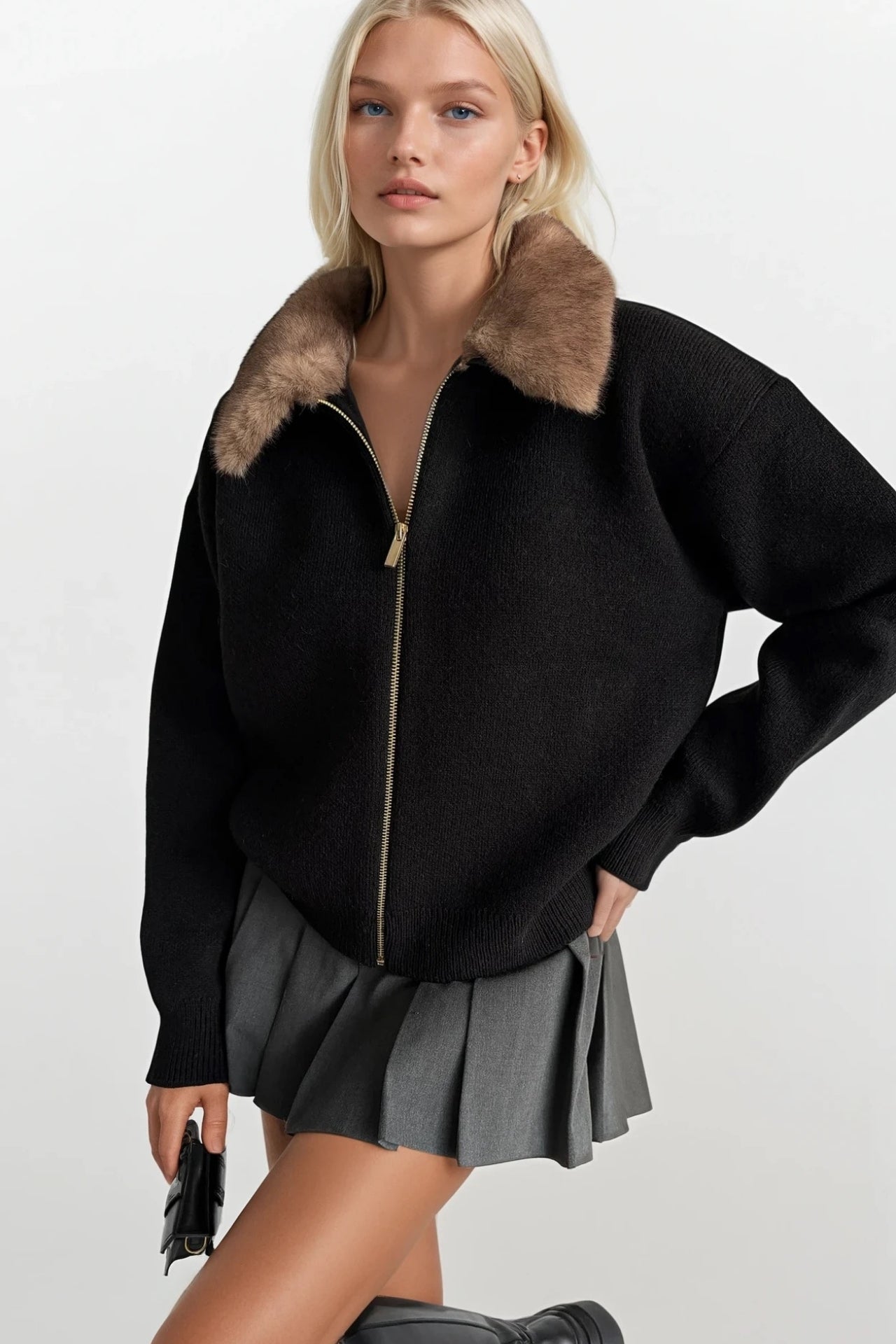 Yaka Kürk Detay Fermuarlı Siyah Triko Kazak