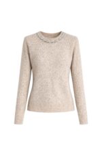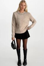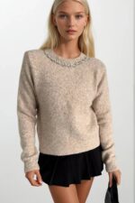 Yaka Taş İşlemeli Bej Triko Kazak