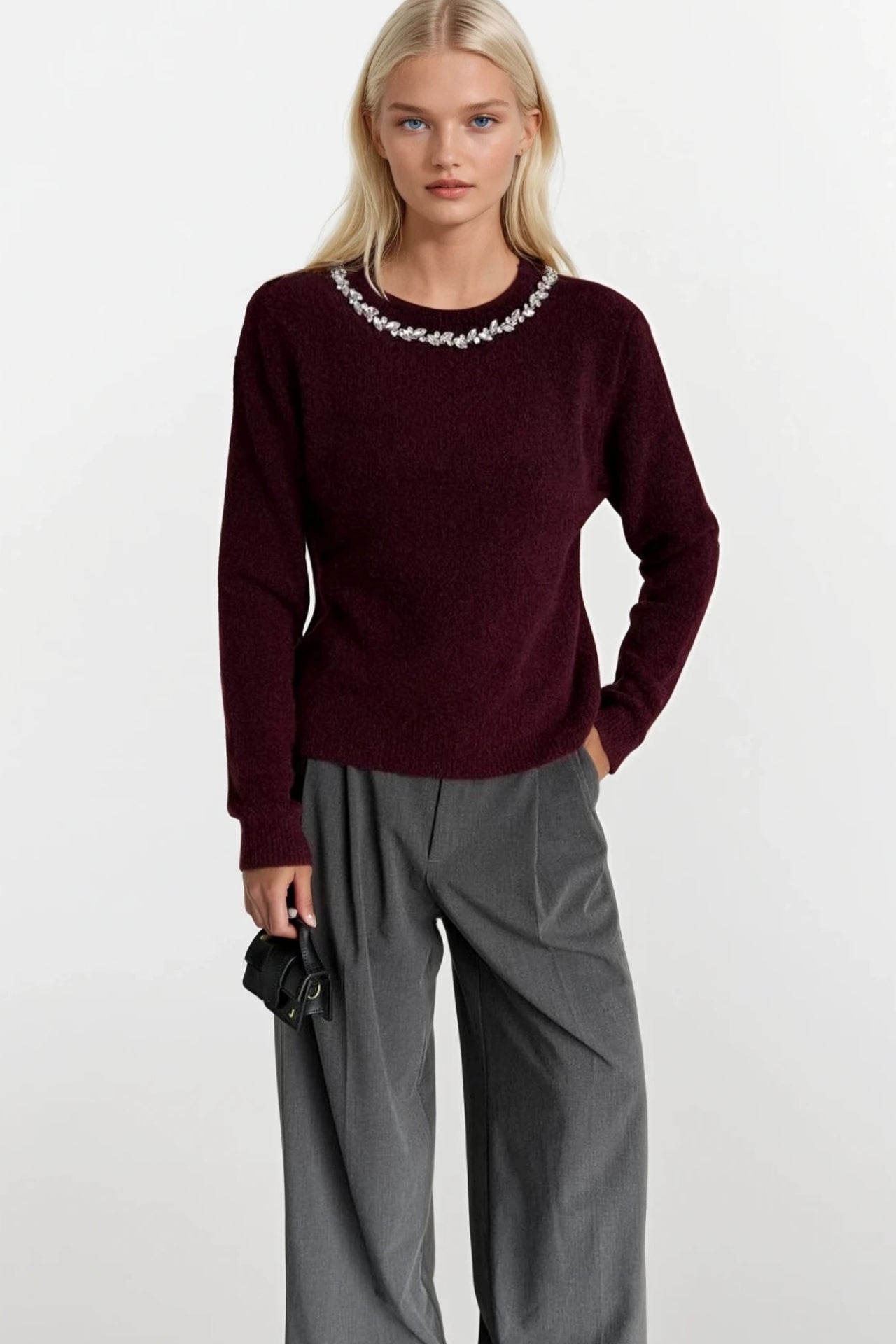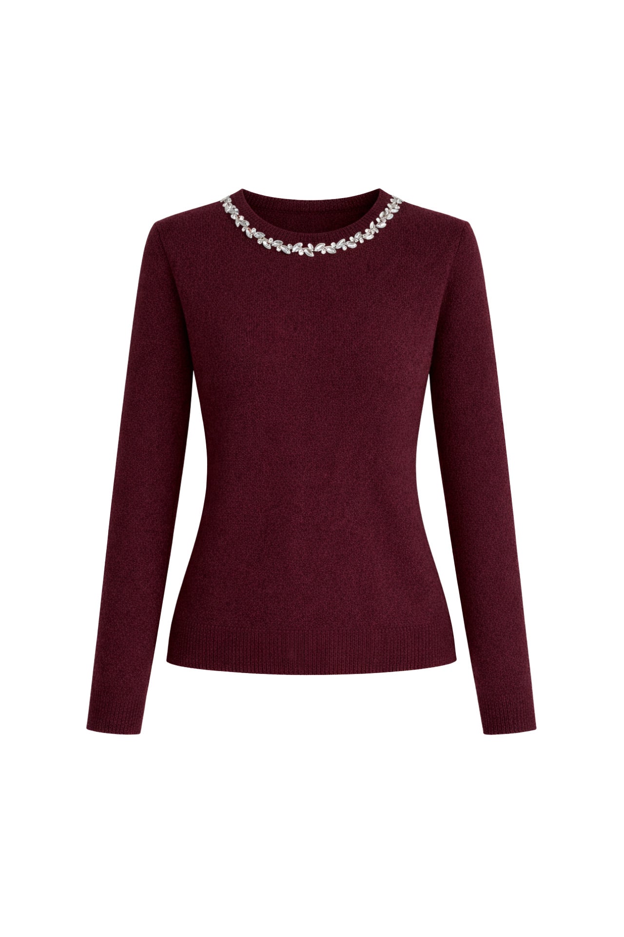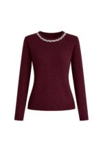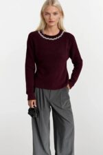 Yaka Taş İşlemeli Bordo Triko Kazak